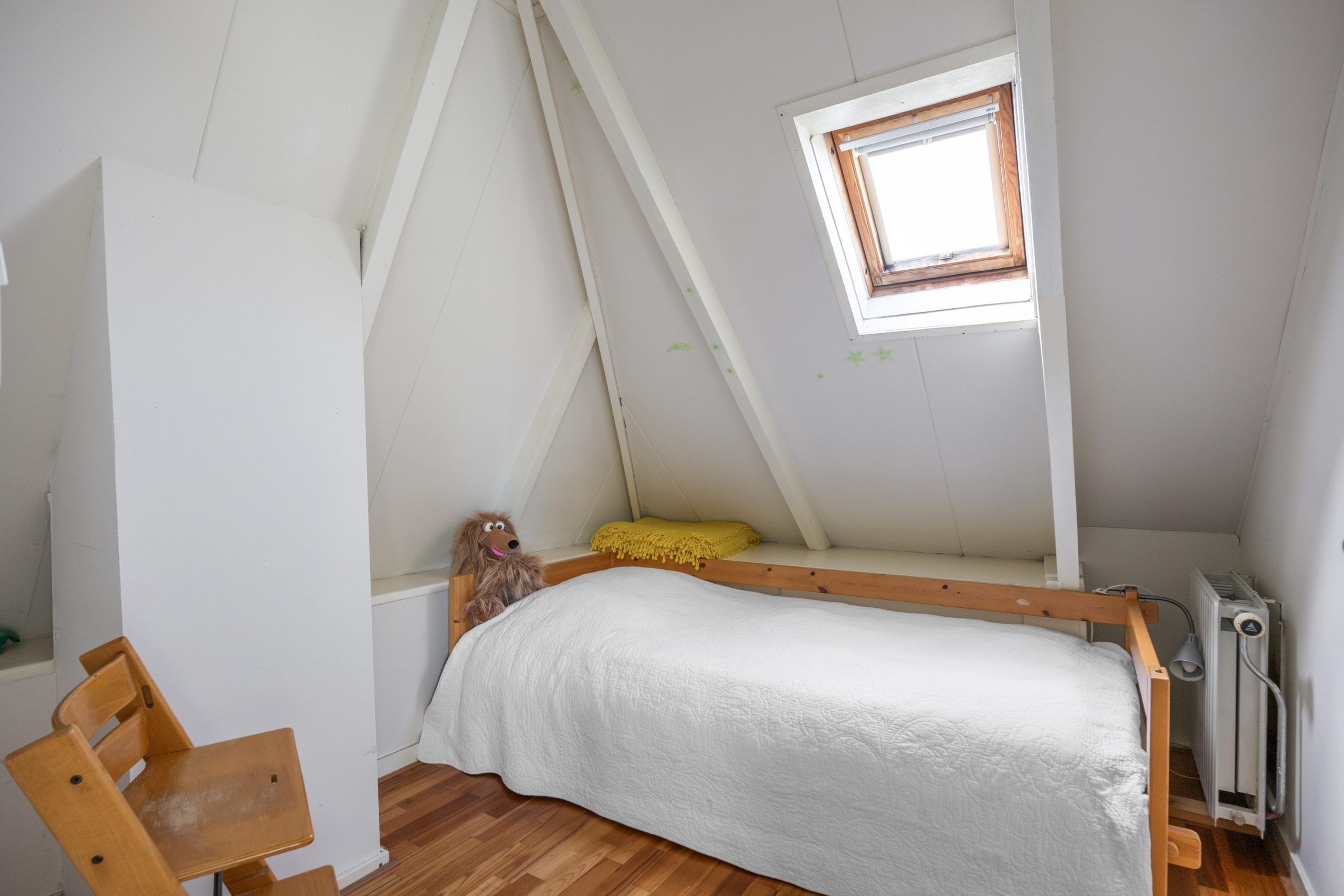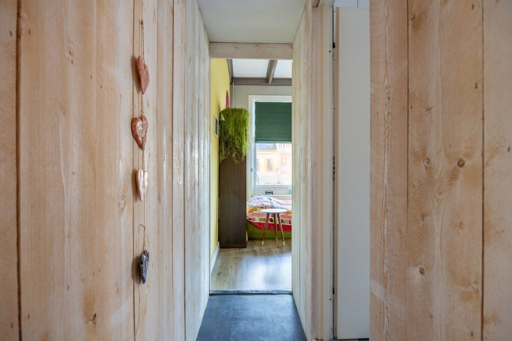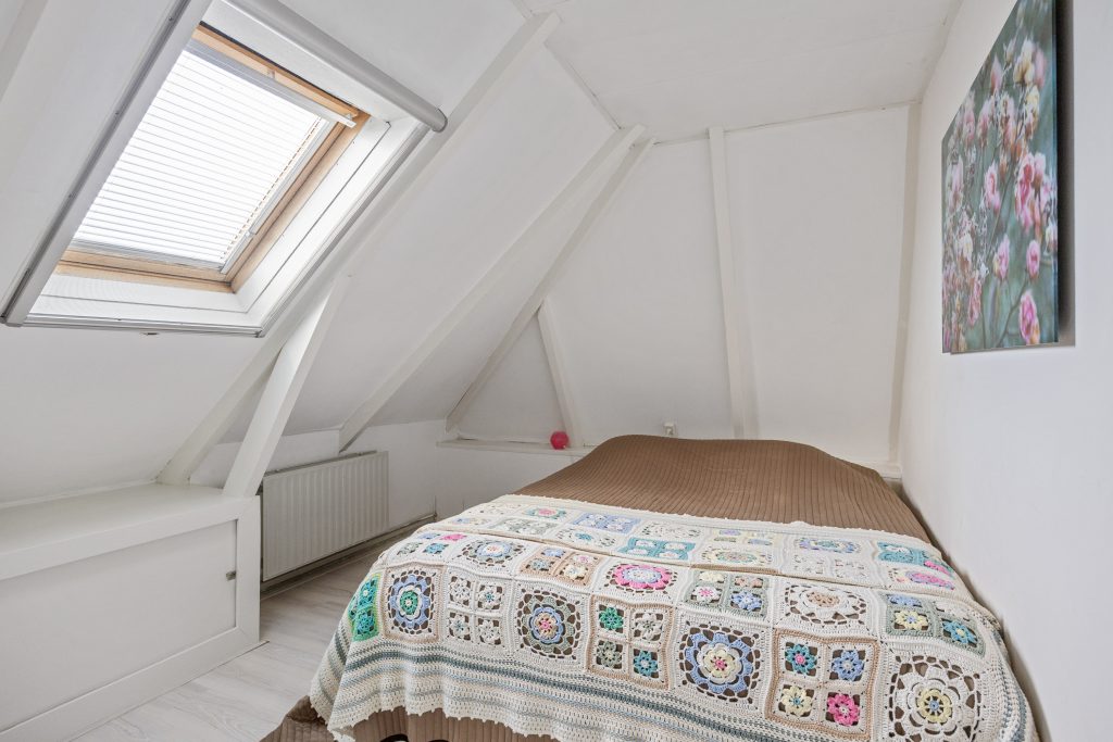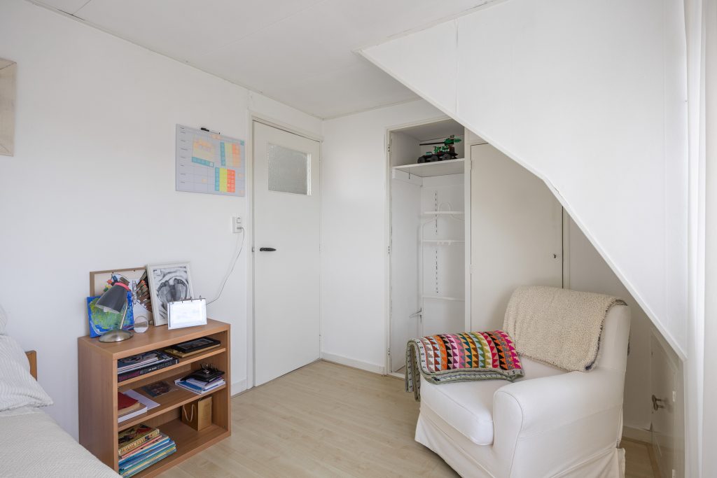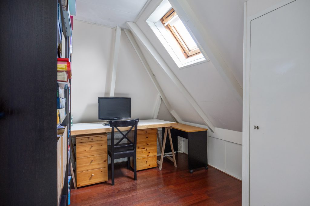 Verdieping: Vanaf de overloop heb je toegang tot de 4 eenvoudig afgetimmerde slaapkamers van resp. 4, 5, 6 en 7m² (gemeten op 1,5m hoogte, i.v.m. de schuine kap). De verdieping is eenvoudig, naar eigen idee en inzicht, opnieuw in te delen. De grote dakkapel aan de achterzijde geeft toegang tot het platte dak.