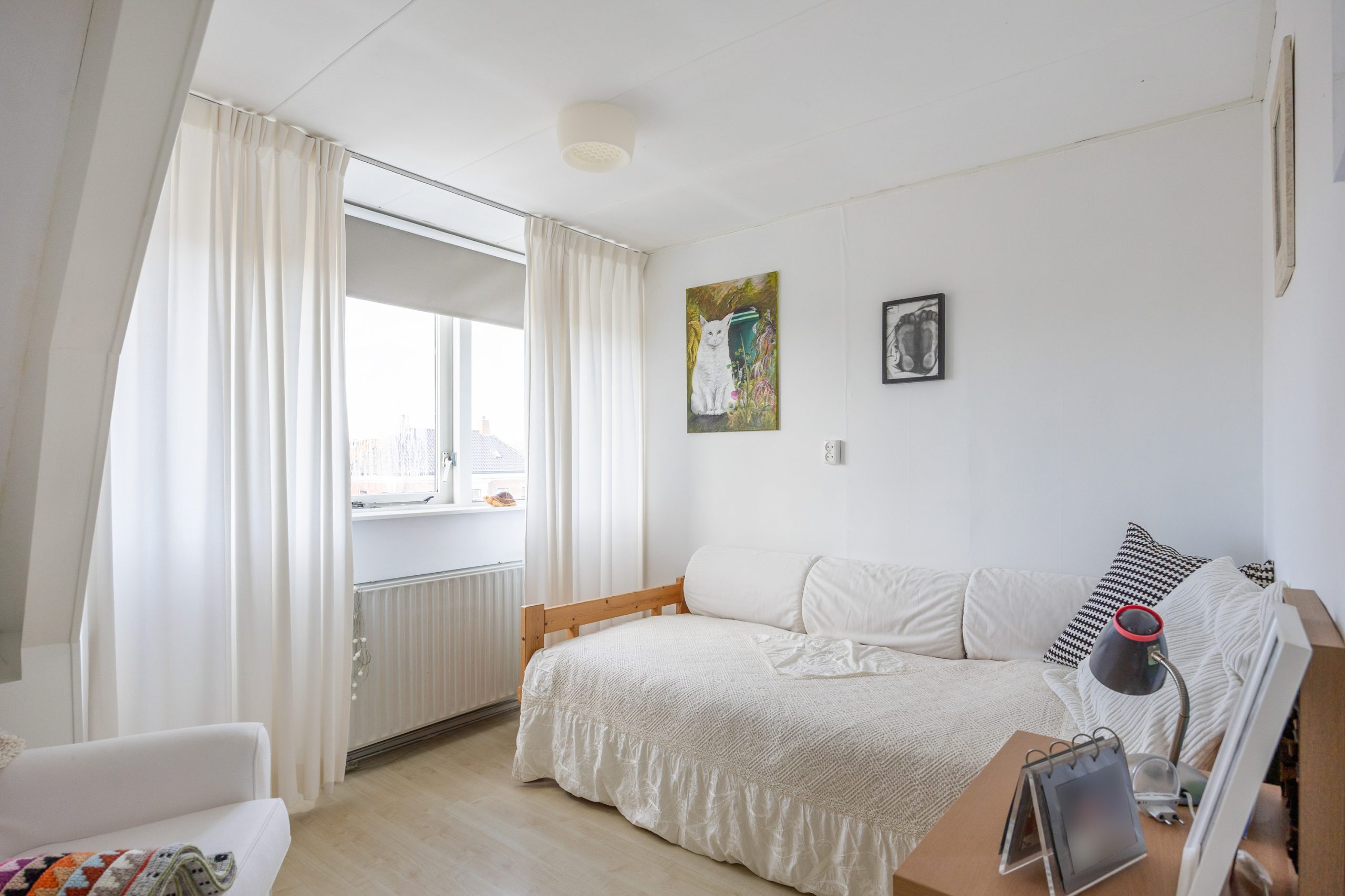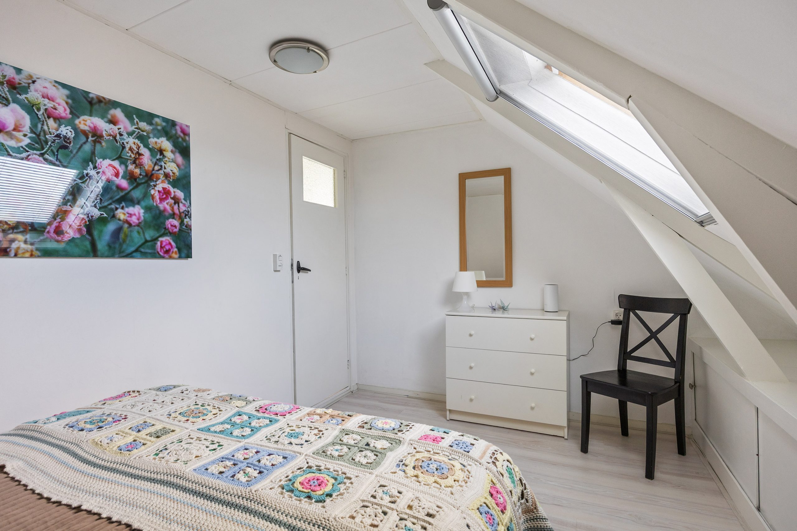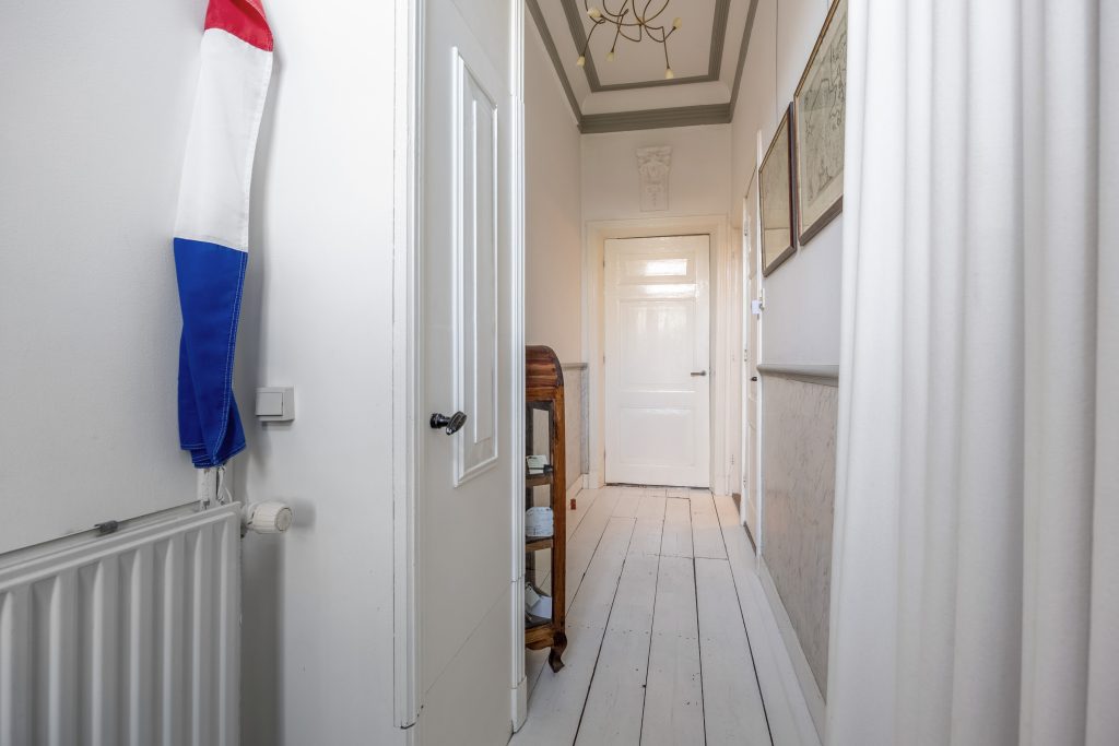 Verdieping: Vanaf de overloop heb je toegang tot de 4 eenvoudig afgetimmerde slaapkamers van resp. 4, 5, 6 en 7m² (gemeten op 1,5m hoogte, i.v.m. de schuine kap). De verdieping is eenvoudig, naar eigen idee en inzicht, opnieuw in te delen. De grote dakkapel aan de achterzijde geeft toegang tot het platte dak.