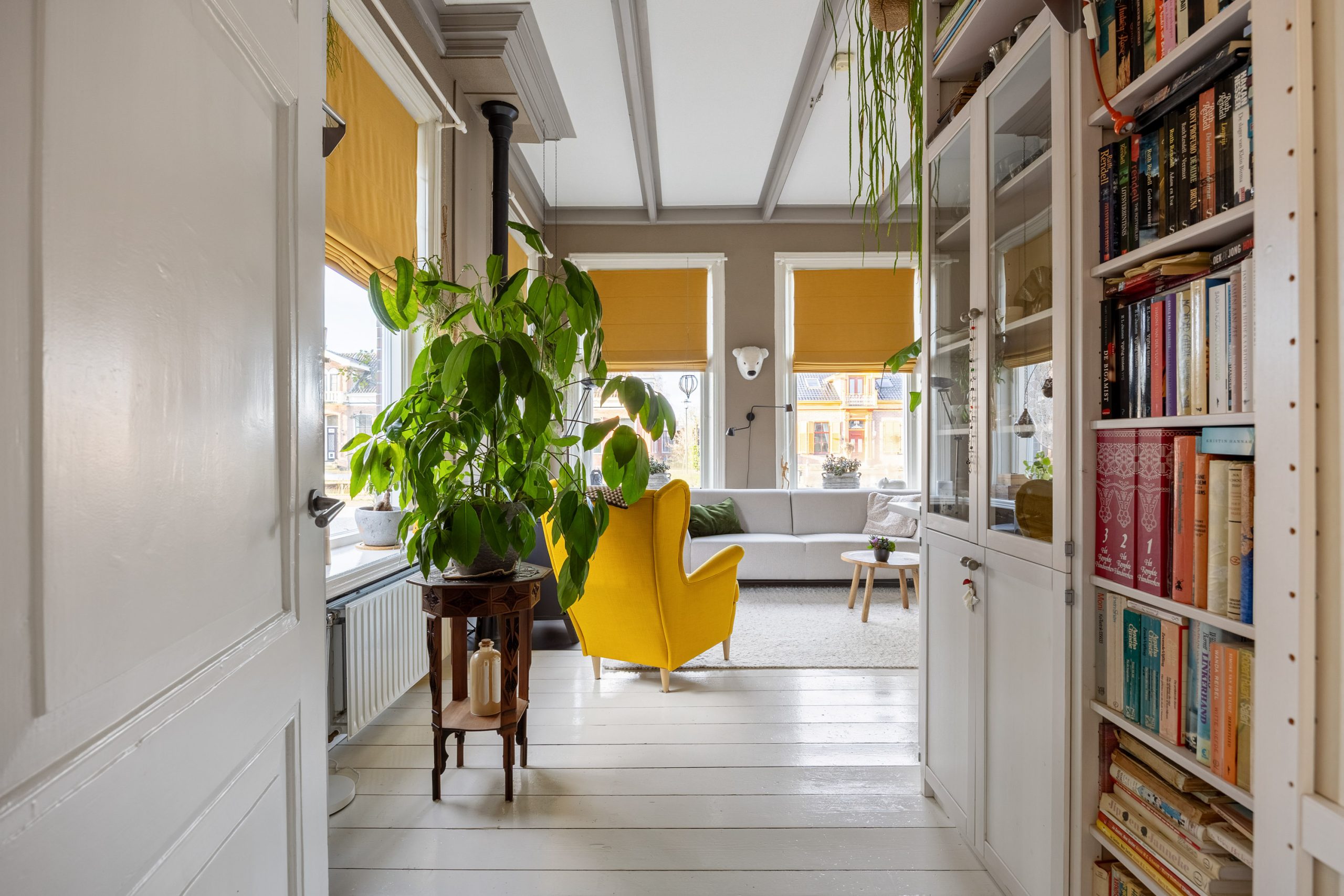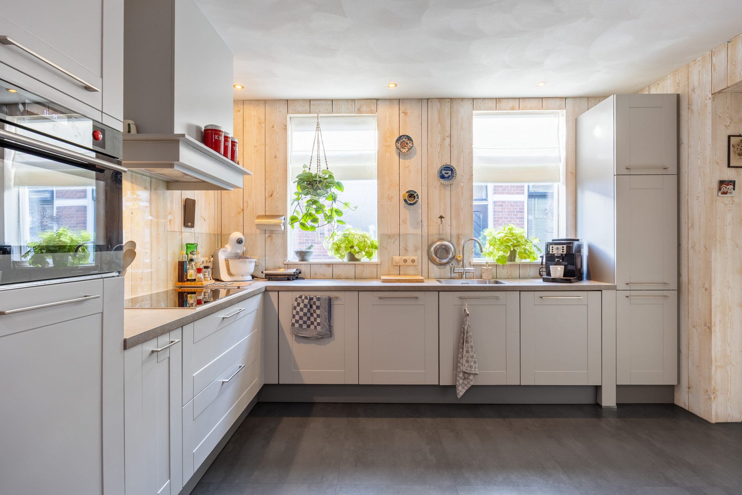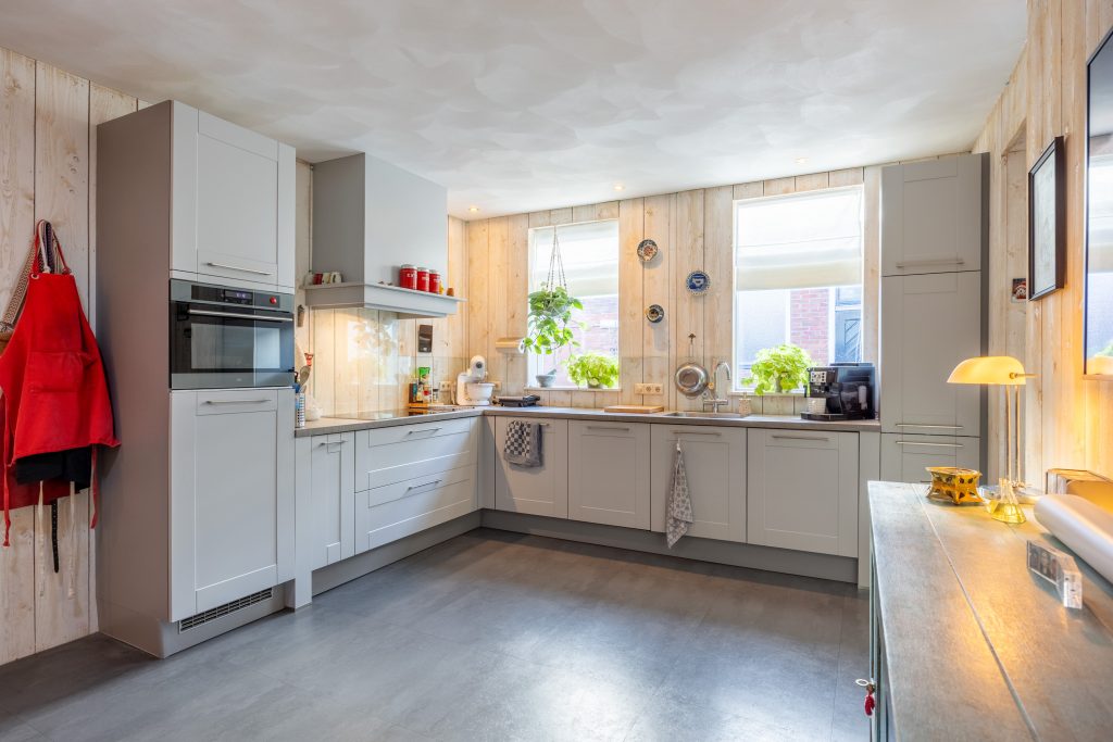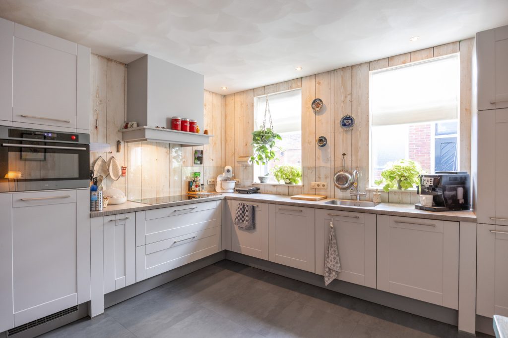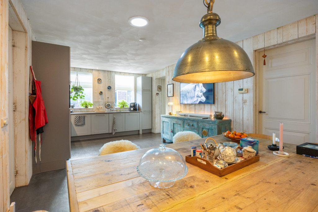 Je komt binnen in de fraaie entree/ centrale gang met meterkast (2025), trapopgang en toegang tot de 7-traps droge kelder. Vervolgens kom je in de ruime, gezellige woonkeuken van ca. 27m² met o.a. vloerverwarming, pvc-vloer, ruimte voor een grote eettafel en een ‘Bruynzeel’ keukeninrichting in hoekopstelling (2013). De keukeninrichting is voorzien van diverse inbouwapparatuur zoals een inductie kookplaat (2021), combi-oven (2024), koelkast (2025), heetwaterkraan, vriezer en vaatwasser (2023). Aan de straatzijde tref je de sfeervolle woonkamer van ca. 23m² met een hoog, balkenplafond, een Lundia inbouwkast, gezellige pelletkachel (2025) en zicht op het Boterdiep. Terug in de keuken is er toegang tot zowel de slaap-/ werkkamer van ca. 23m² met vloerverwarming en pvc-vloer, de badkamer met douche, dubbele wastafel en toilet en tot slot de slaapkamer van ruim 18,5m² met schouw en balken plafond. Het achterhuis/ de ruime bijkeuken is gesitueerd achter de keuken met o.a. de witgoedaansluitingen, bergruimte, toilet met fraai plafond, bergzolder en zowel toegang tot de gedeelde oprit, de inpandige schuurruimte en middels openslaande deuren tot de serre/ terrasoverkapping.