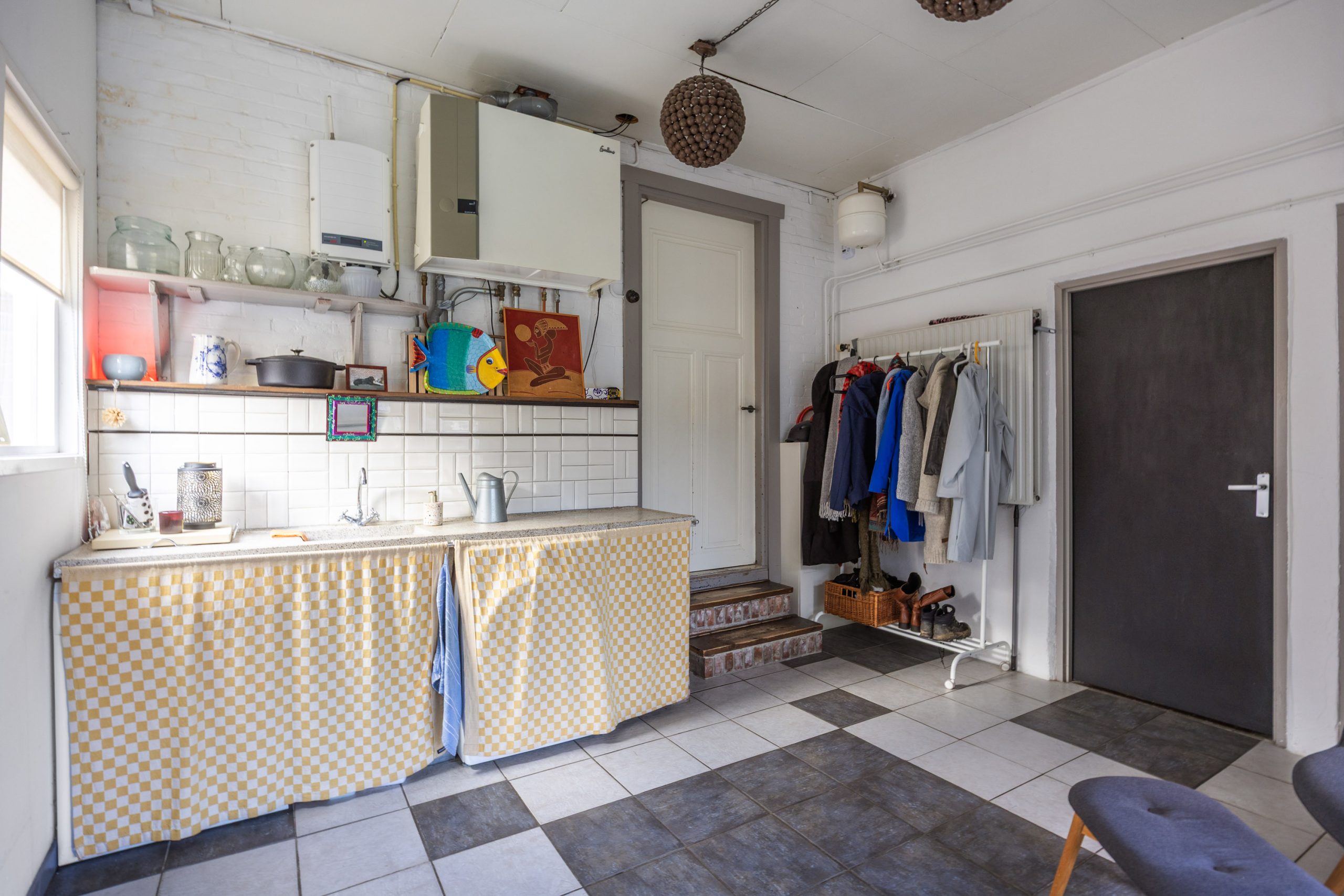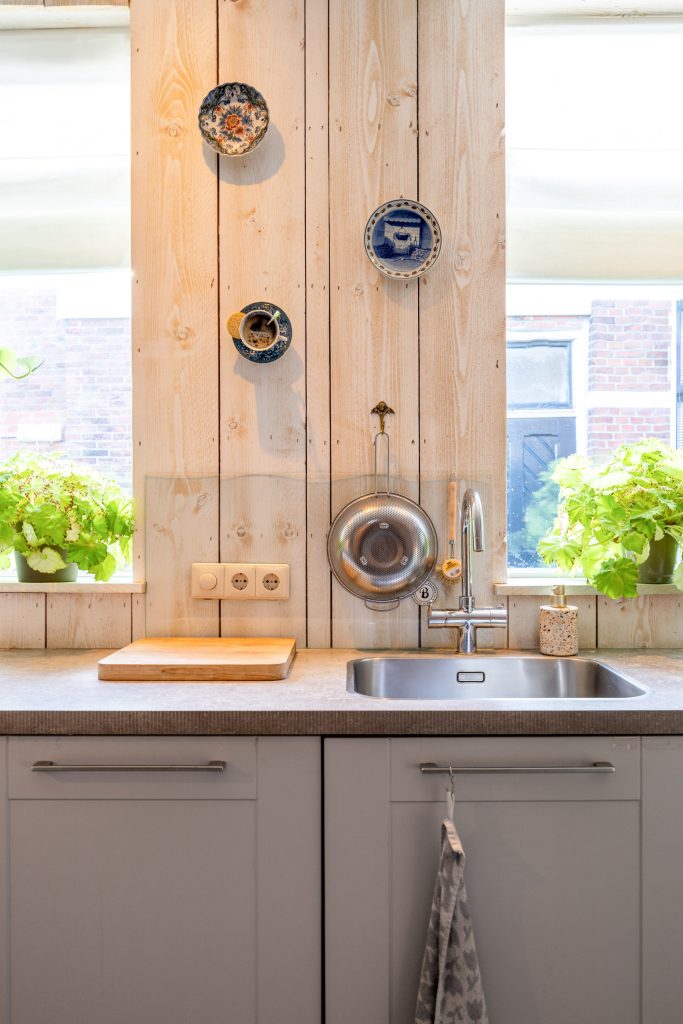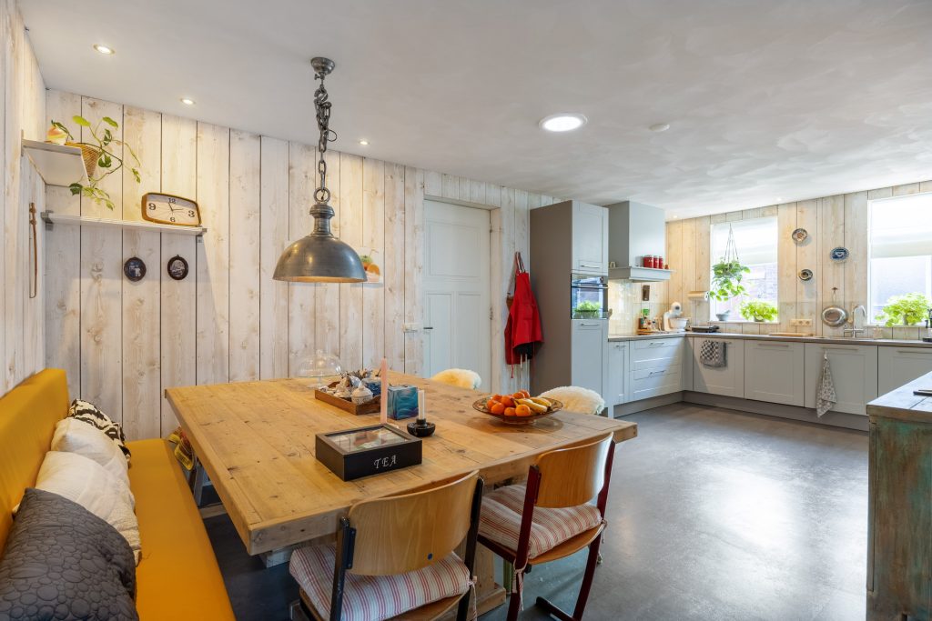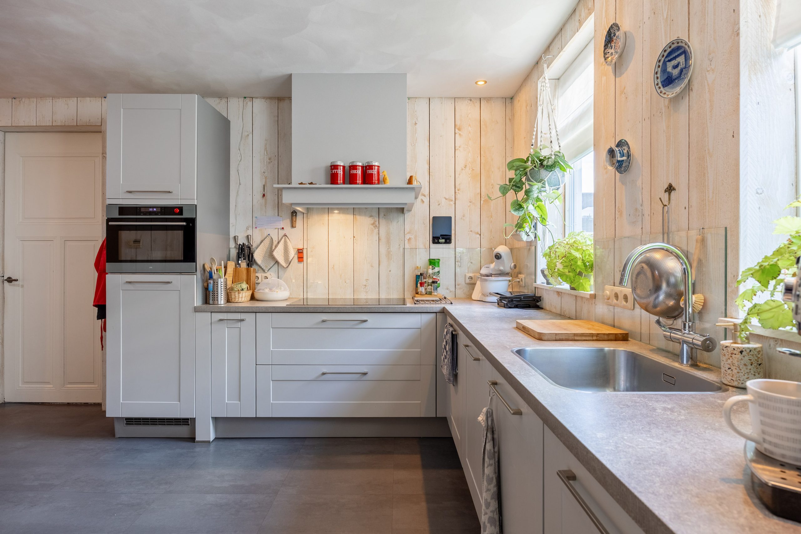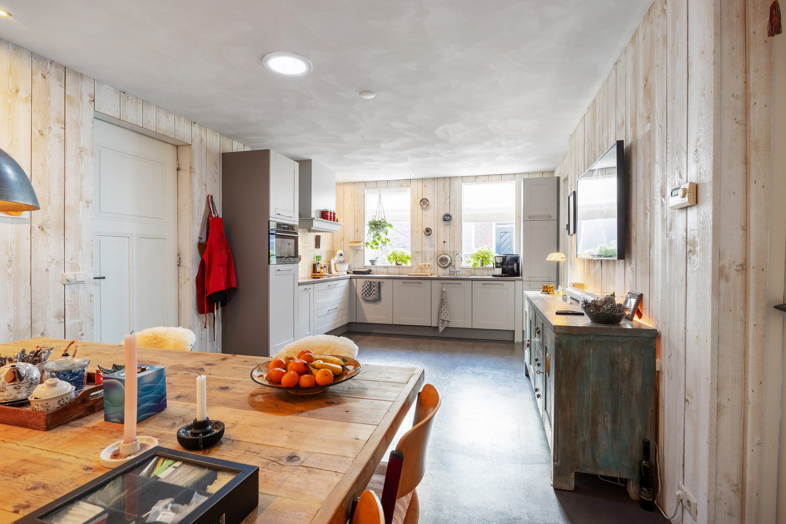 Je komt binnen in de fraaie entree/ centrale gang met meterkast (2025), trapopgang en toegang tot de 7-traps droge kelder. Vervolgens kom je in de ruime, gezellige woonkeuken van ca. 27m² met o.a. vloerverwarming, pvc-vloer, ruimte voor een grote eettafel en een ‘Bruynzeel’ keukeninrichting in hoekopstelling (2013). De keukeninrichting is voorzien van diverse inbouwapparatuur zoals een inductie kookplaat (2021), combi-oven (2024), koelkast (2025), heetwaterkraan, vriezer en vaatwasser (2023). Aan de straatzijde tref je de sfeervolle woonkamer van ca. 23m² met een hoog, balkenplafond, een Lundia inbouwkast, gezellige pelletkachel (2025) en zicht op het Boterdiep. Terug in de keuken is er toegang tot zowel de slaap-/ werkkamer van ca. 23m² met vloerverwarming en pvc-vloer, de badkamer met douche, dubbele wastafel en toilet en tot slot de slaapkamer van ruim 18,5m² met schouw en balken plafond. Het achterhuis/ de ruime bijkeuken is gesitueerd achter de keuken met o.a. de witgoedaansluitingen, bergruimte, toilet met fraai plafond, bergzolder en zowel toegang tot de gedeelde oprit, de inpandige schuurruimte en middels openslaande deuren tot de serre/ terrasoverkapping.