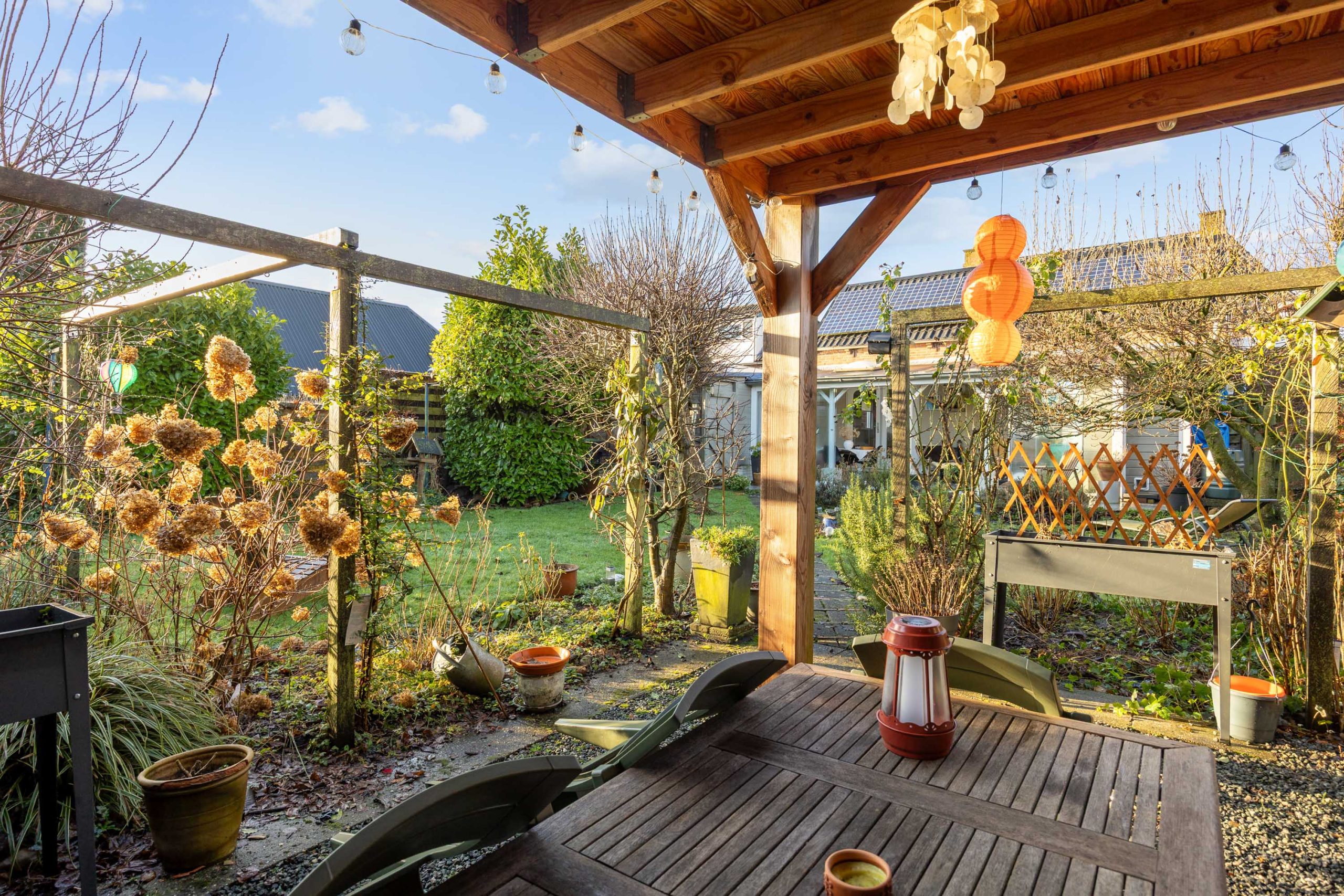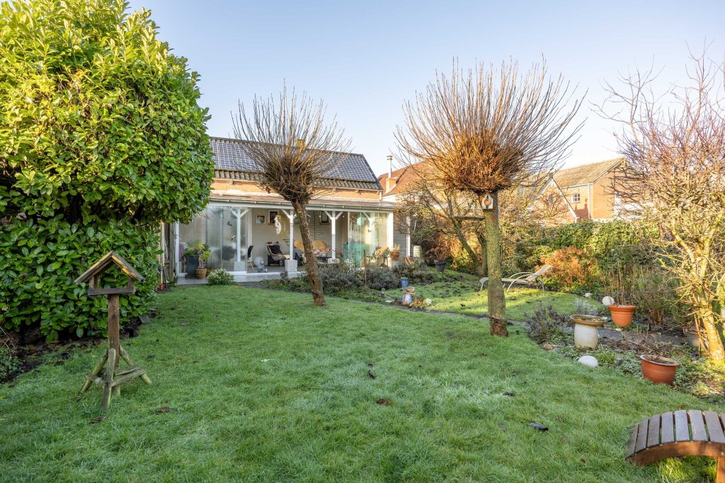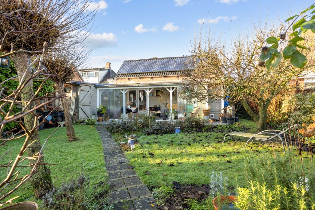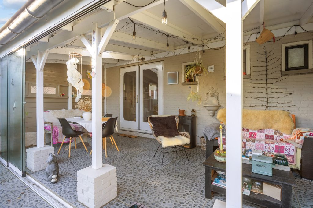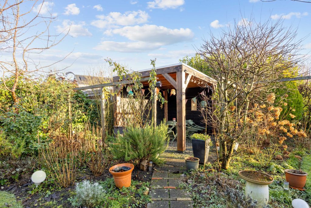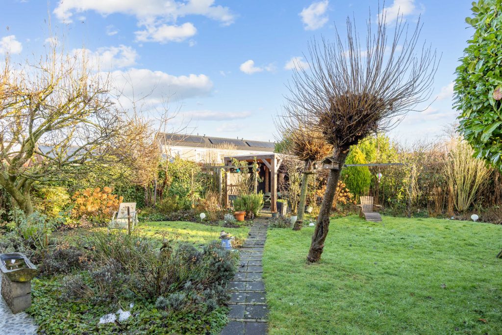 Een heerlijke, verrassende tuin met een besloten karakter en veel privacy door het ontbreken van directe achterburen. Je betreedt de tuin vanaf de oprit of vanuit de gezellige serre die gesitueerd is aan de woning. De serre is voorzien van een volledige glaswand zodat je ook op mindere dagen gebruik kunt maken van deze sfeervolle ruimte. De tuin zelf bestaat uit borders, gazon, terras en een tweede veranda/ terrasoverkapping achter in de tuin.