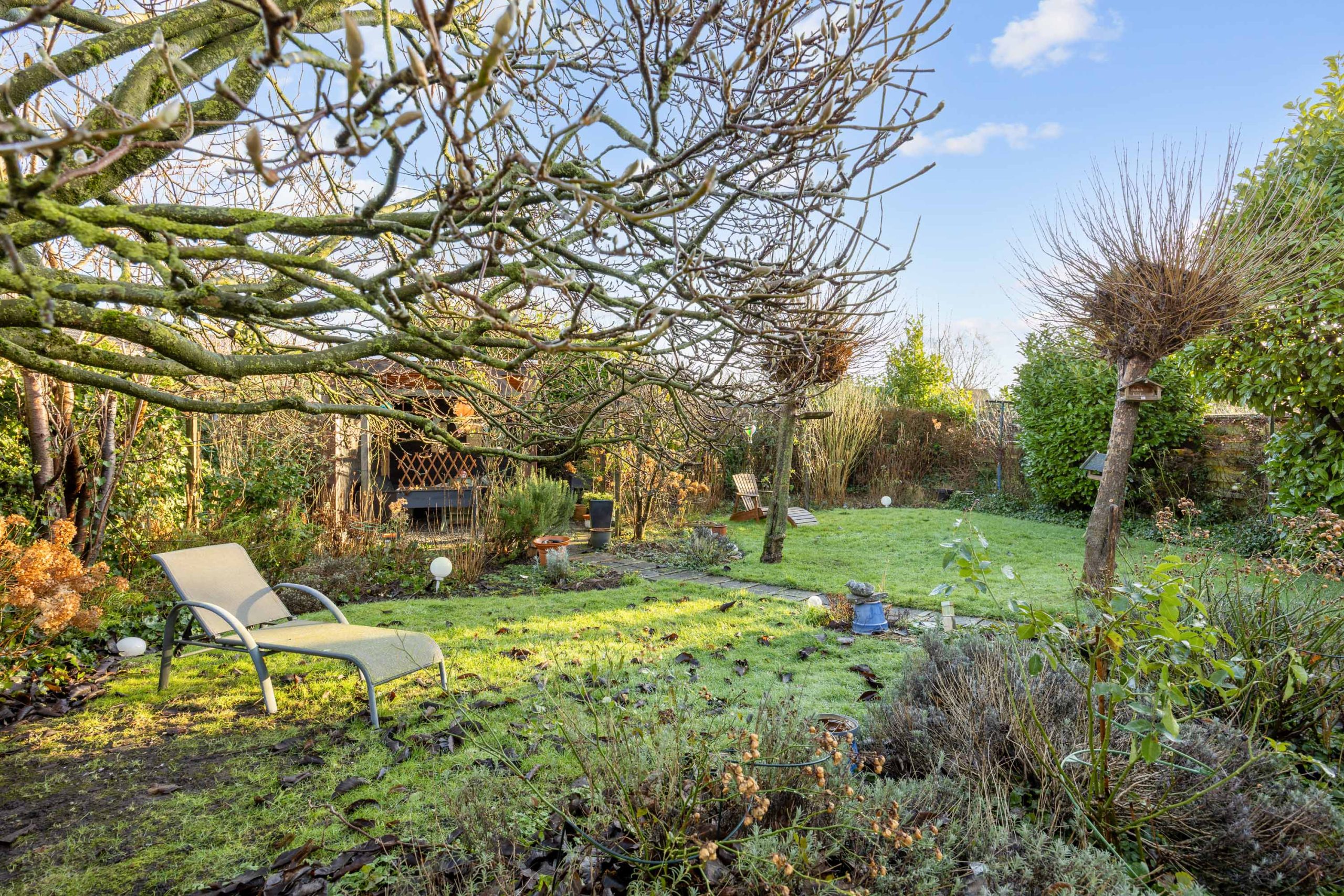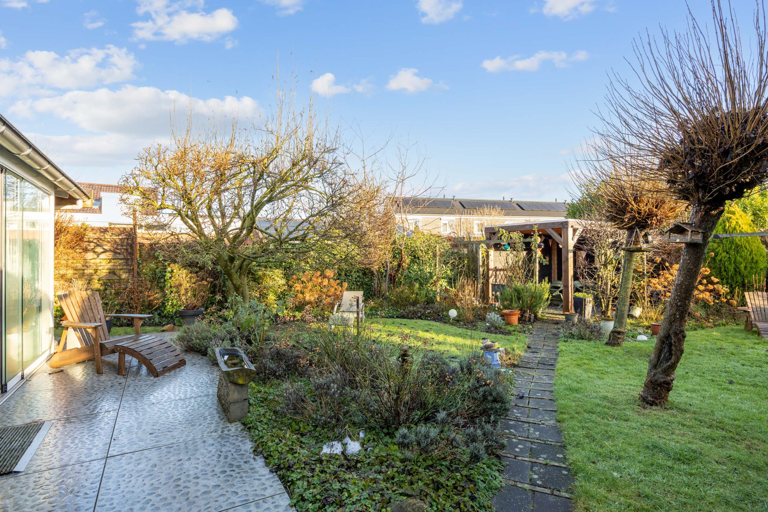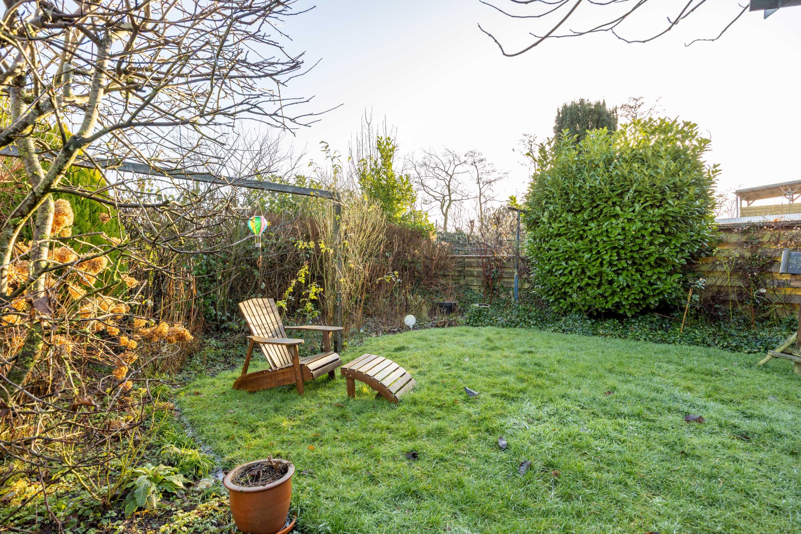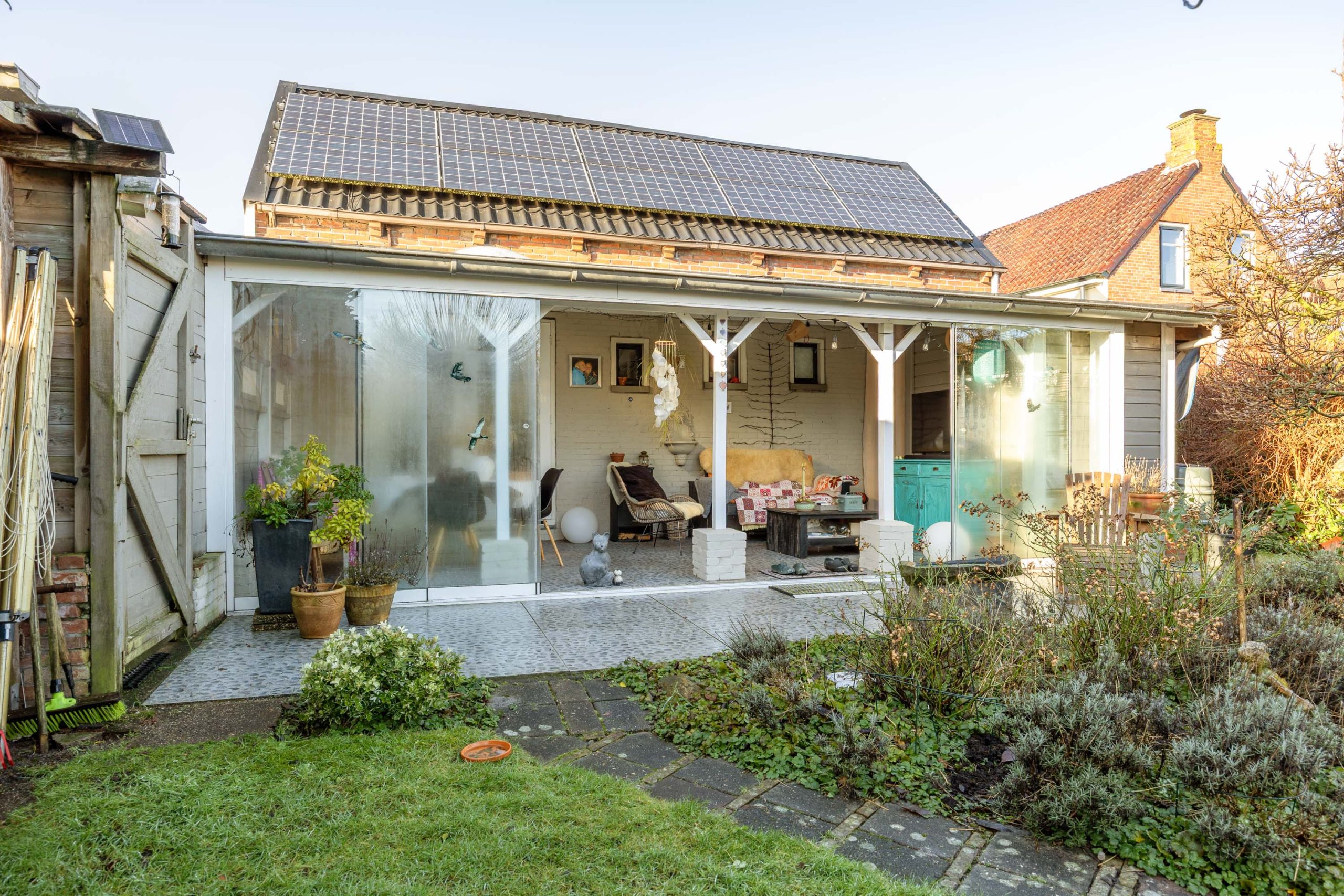 Een heerlijke, verrassende tuin met een besloten karakter en veel privacy door het ontbreken van directe achterburen. Je betreedt de tuin vanaf de oprit of vanuit de gezellige serre die gesitueerd is aan de woning. De serre is voorzien van een volledige glaswand zodat je ook op mindere dagen gebruik kunt maken van deze sfeervolle ruimte. De tuin zelf bestaat uit borders, gazon, terras en een tweede veranda/ terrasoverkapping achter in de tuin.