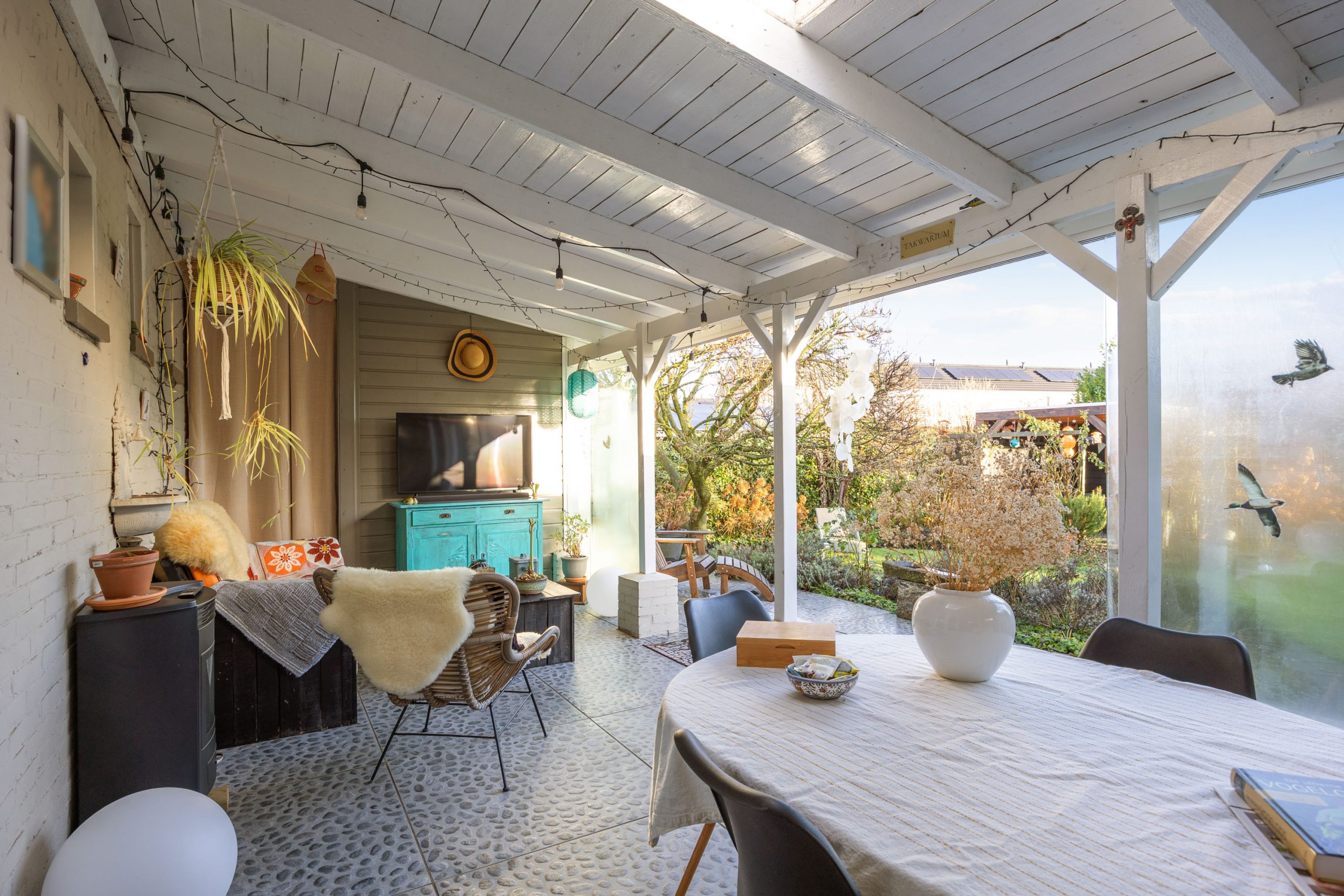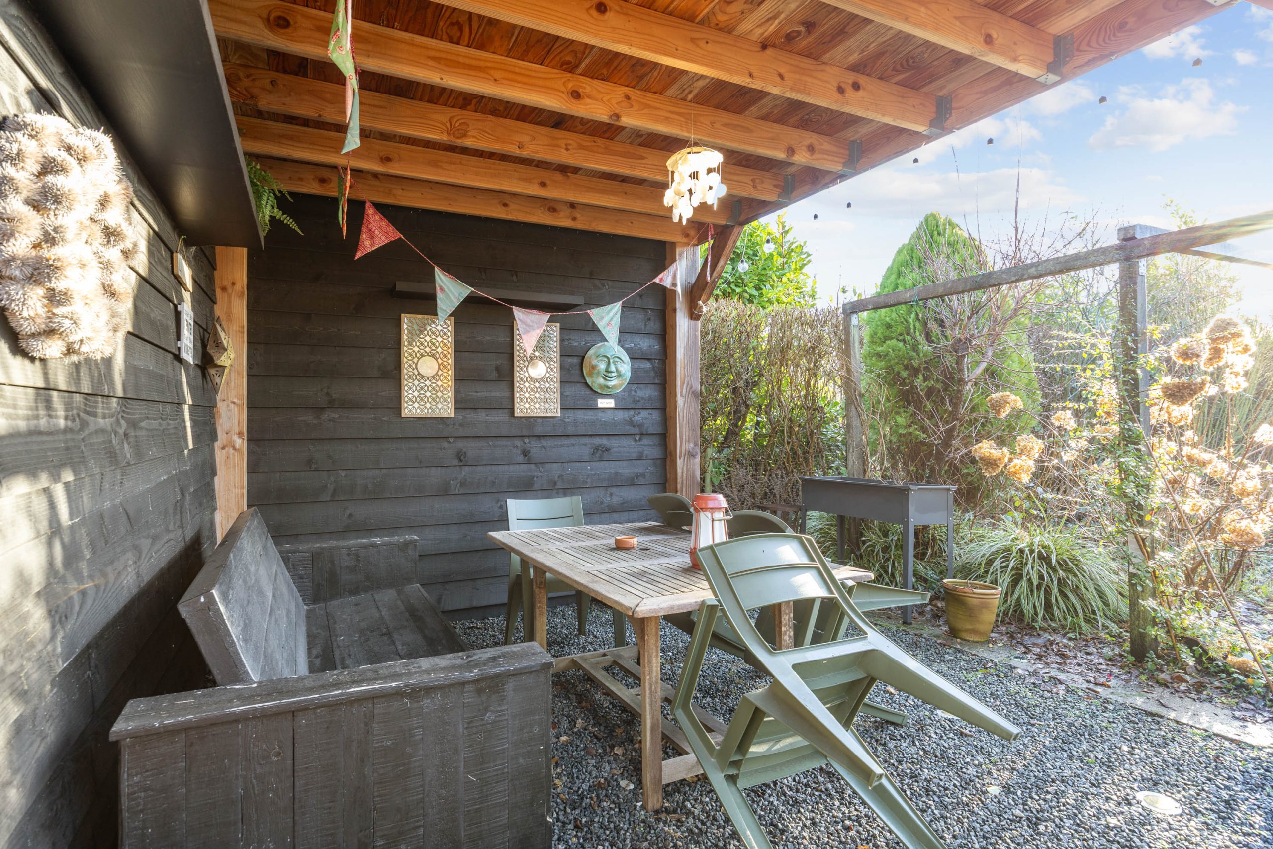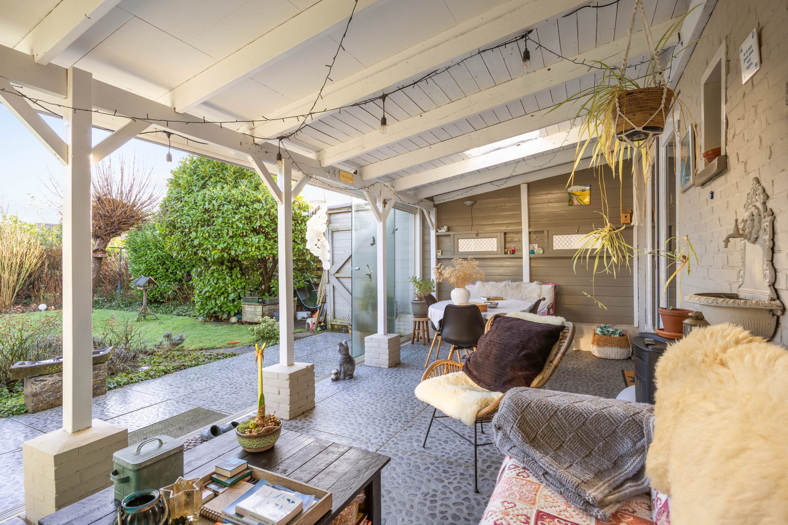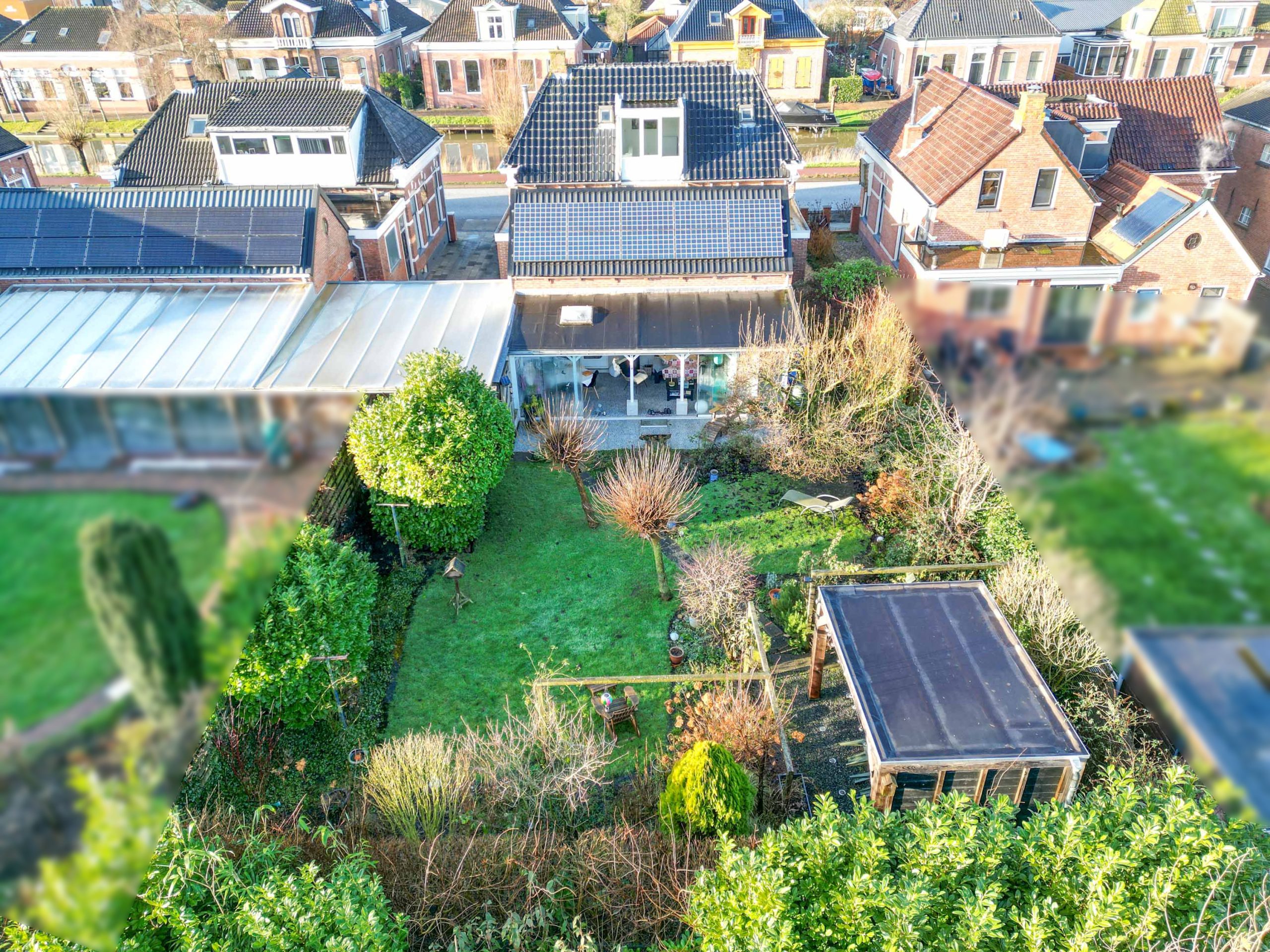 Een heerlijke, verrassende tuin met een besloten karakter en veel privacy door het ontbreken van directe achterburen. Je betreedt de tuin vanaf de oprit of vanuit de gezellige serre die gesitueerd is aan de woning. De serre is voorzien van een volledige glaswand zodat je ook op mindere dagen gebruik kunt maken van deze sfeervolle ruimte. De tuin zelf bestaat uit borders, gazon, terras en een tweede veranda/ terrasoverkapping achter in de tuin.