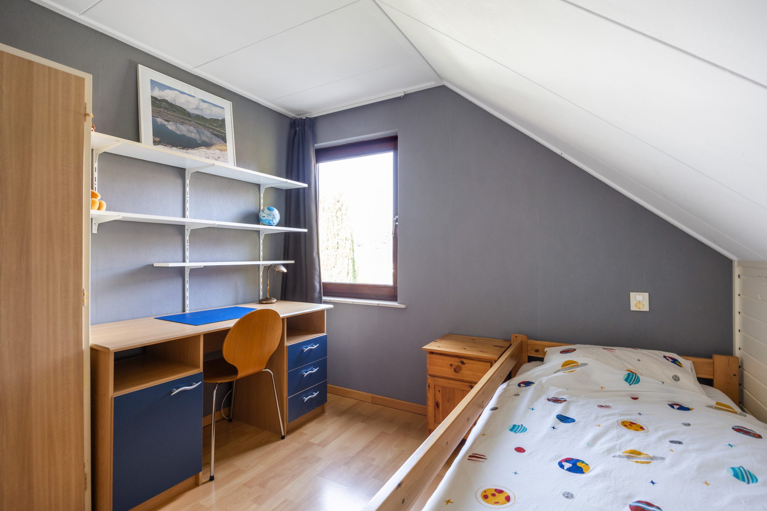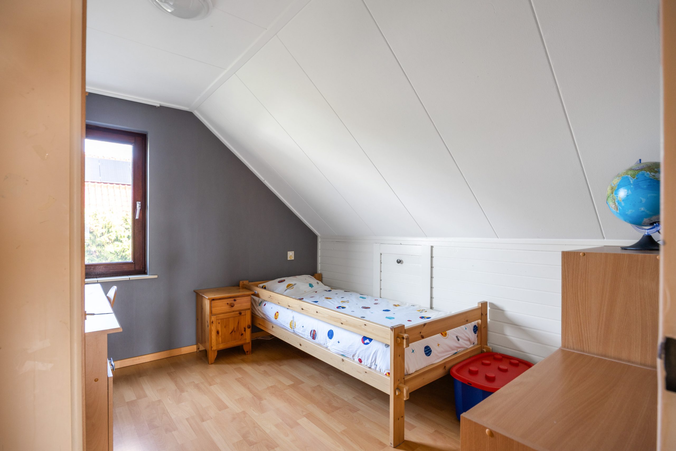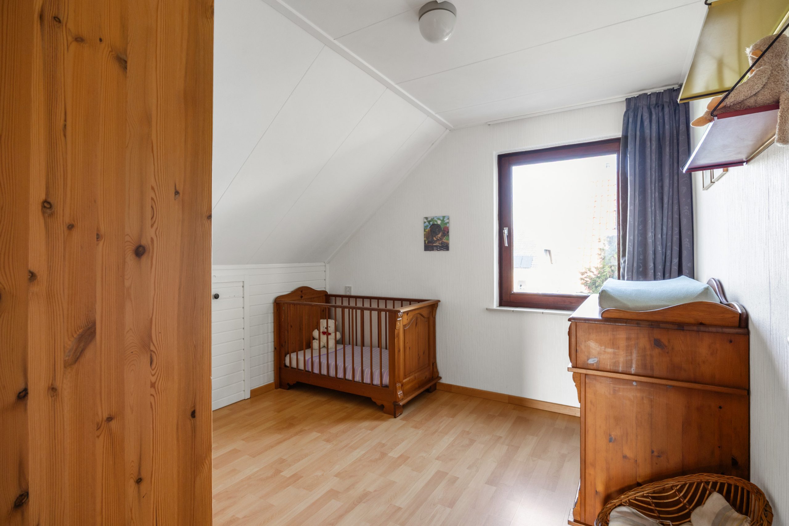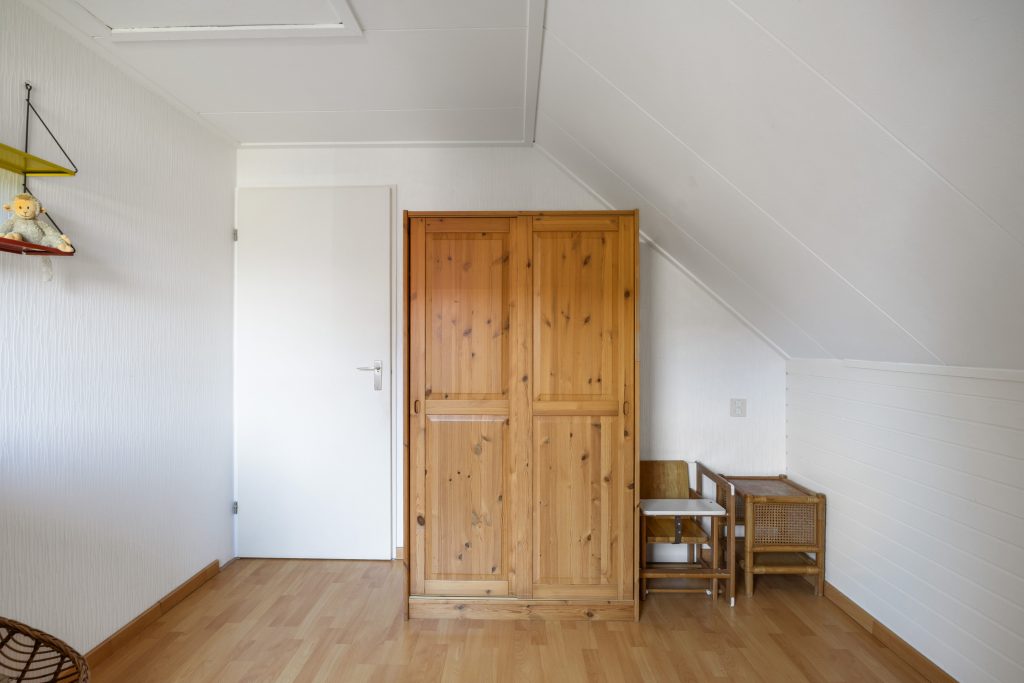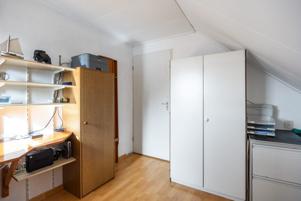 De verdieping bestaat uit een overloop met separaat toilet en toegang tot de 4 prima slaapkamers van resp. ca. 7,5, 8,5, 8,5 en 9m² (gemeten op 1,5 meter hoogte ivm de schuine wanden) en de badkamer voorzien van douche, ligbad, wastafelmeubel en mechanische ventilatie. Boven de slaapkamers zijn nog 2 bergzolders bereikbaar (nokhoogte 1.45m)