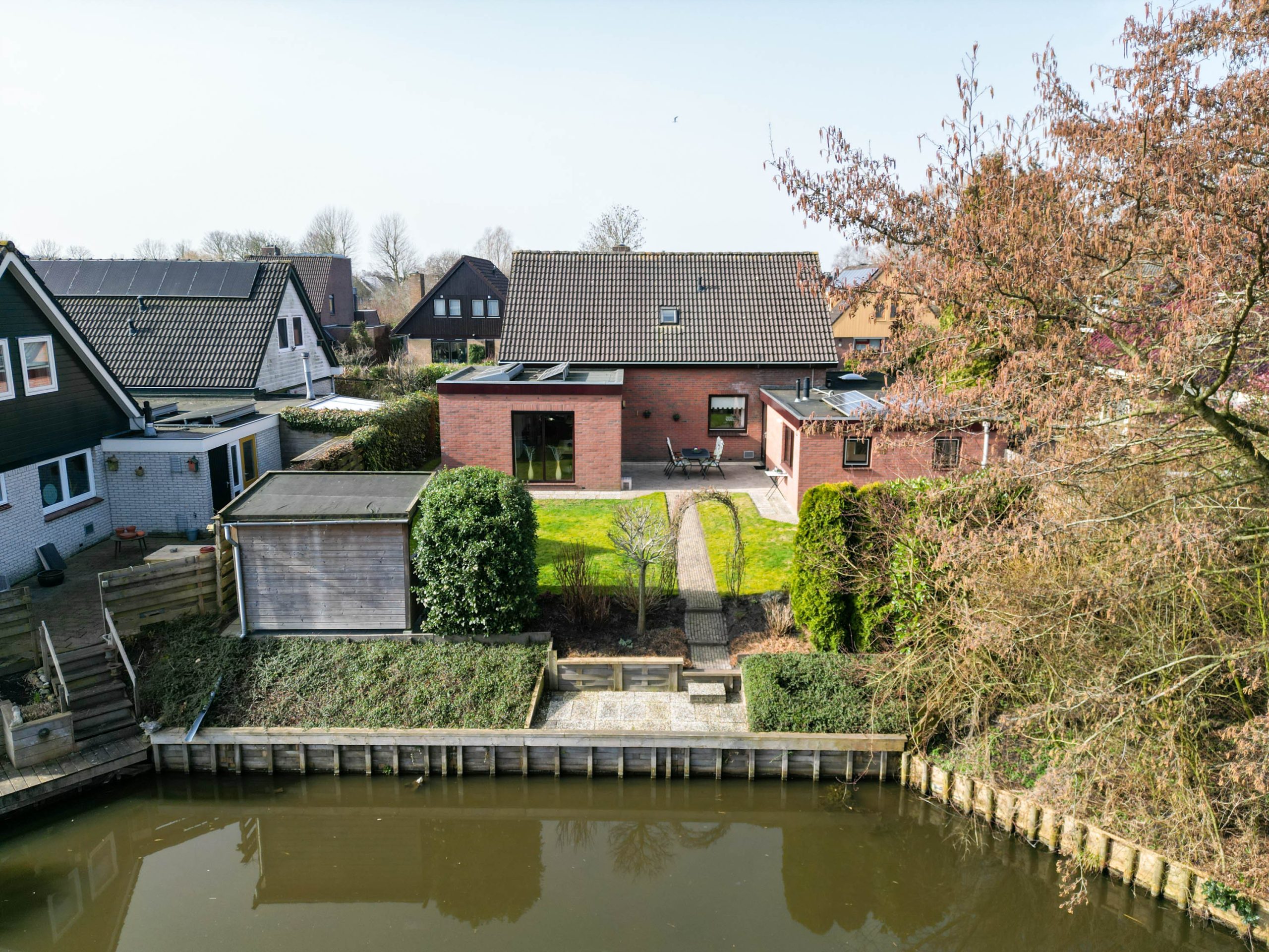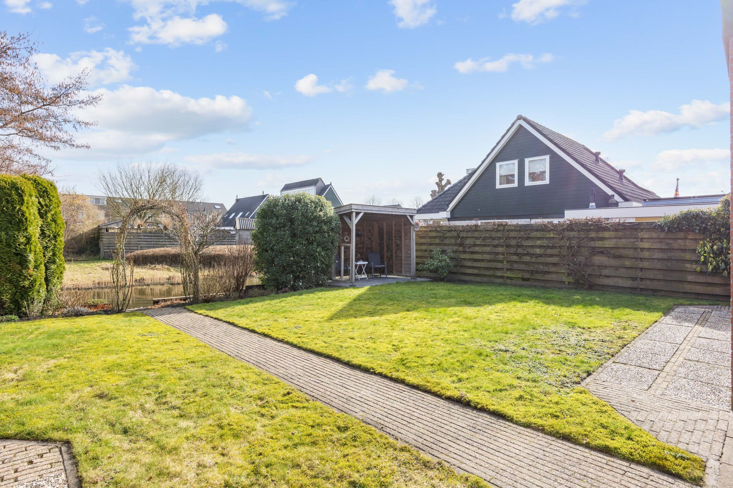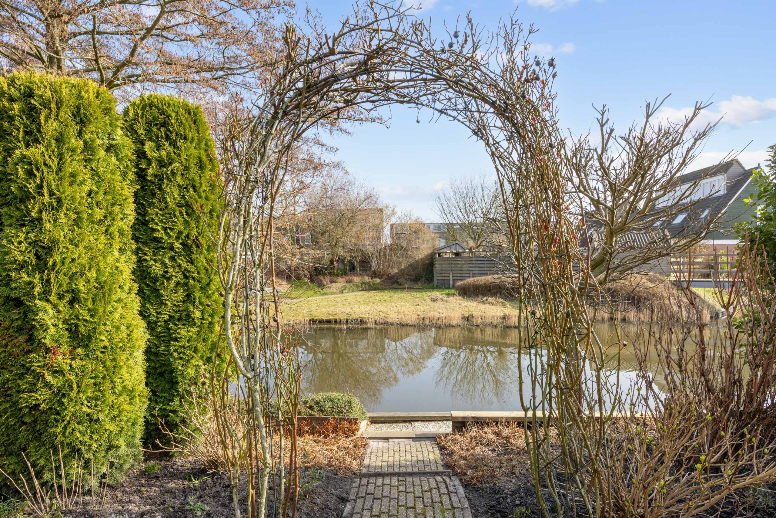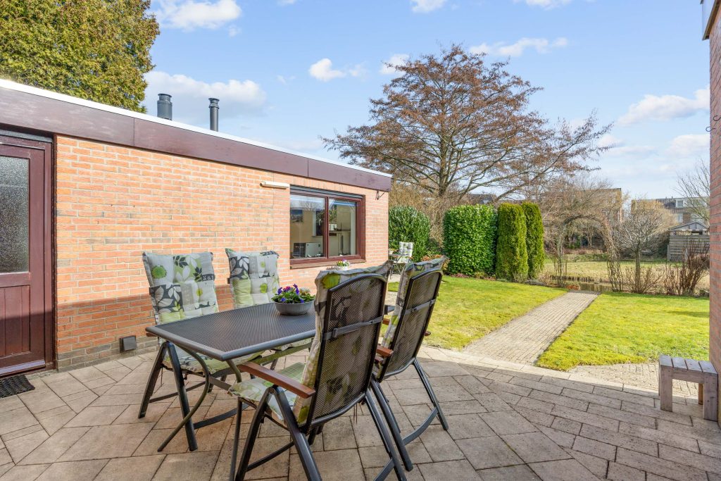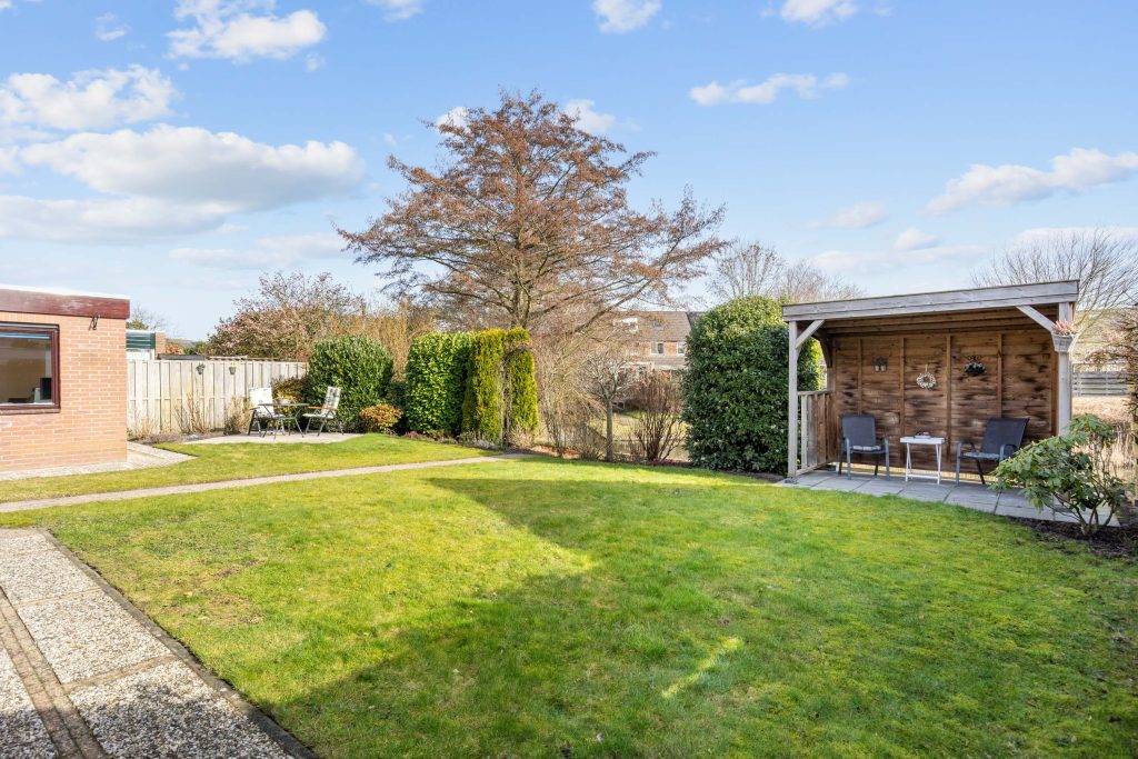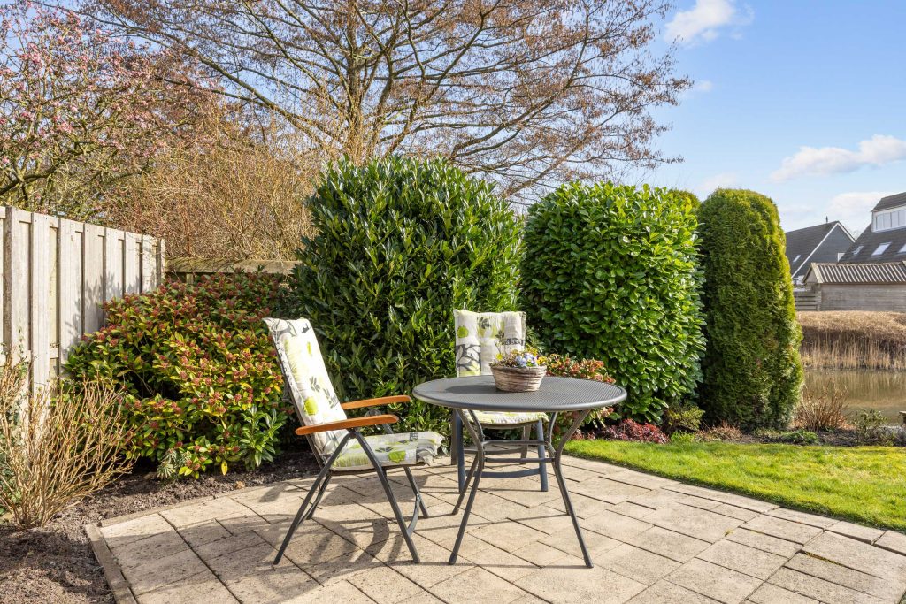 De ruime, zonnige tuin heeft een besloten karakter met veel privacy en bestaat uit een overkapping, gazon, terrassen, borders en grenst direct aan het water van het Geert Reinderspark.