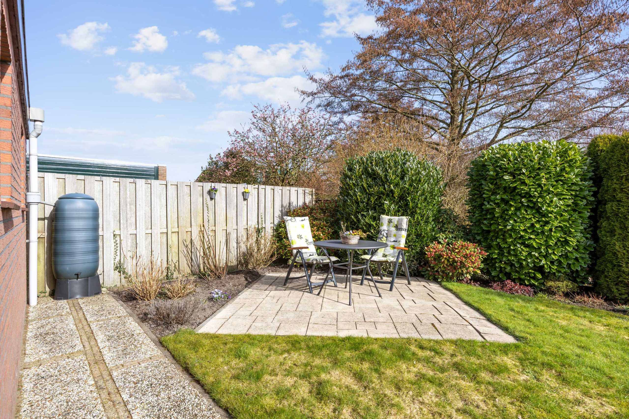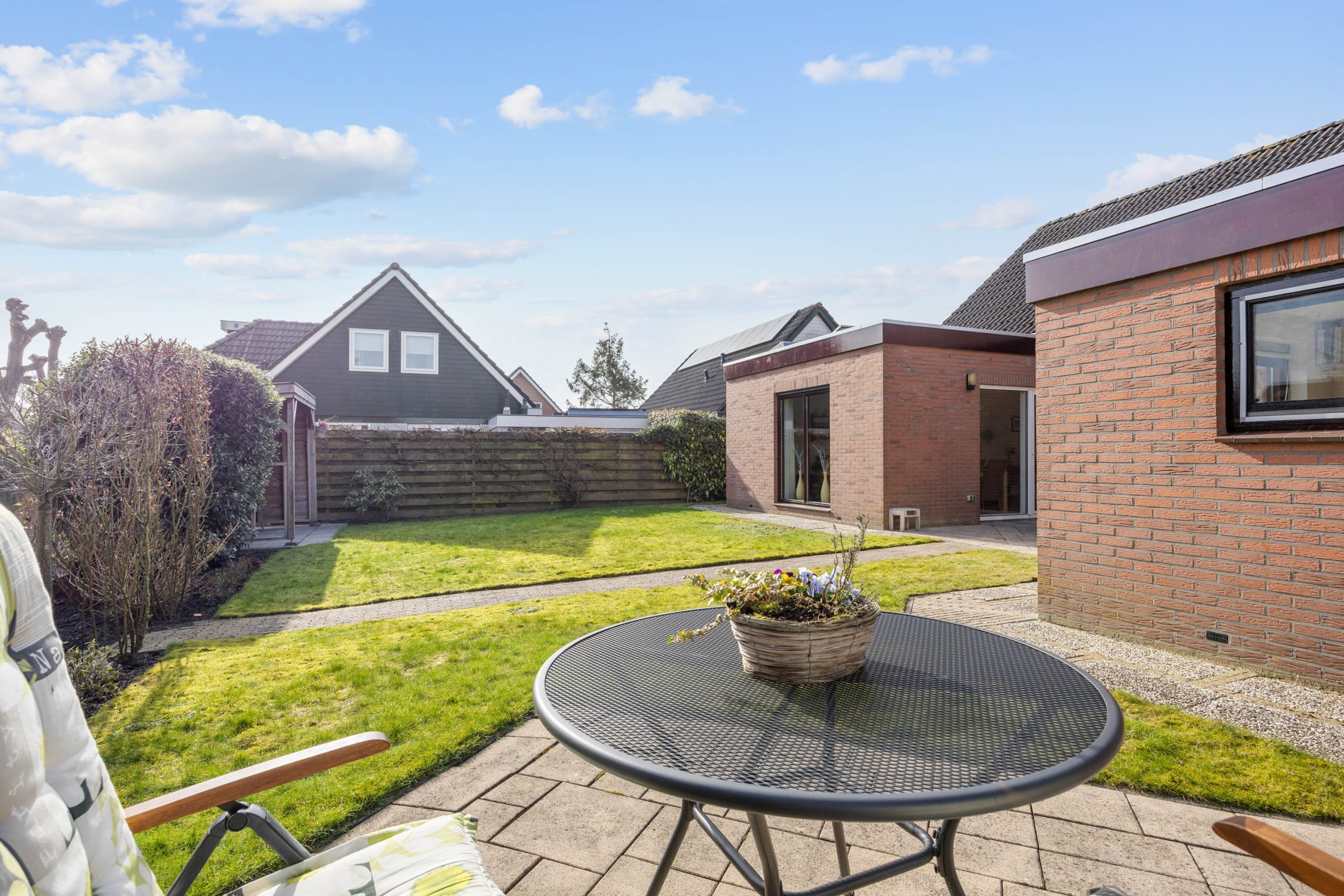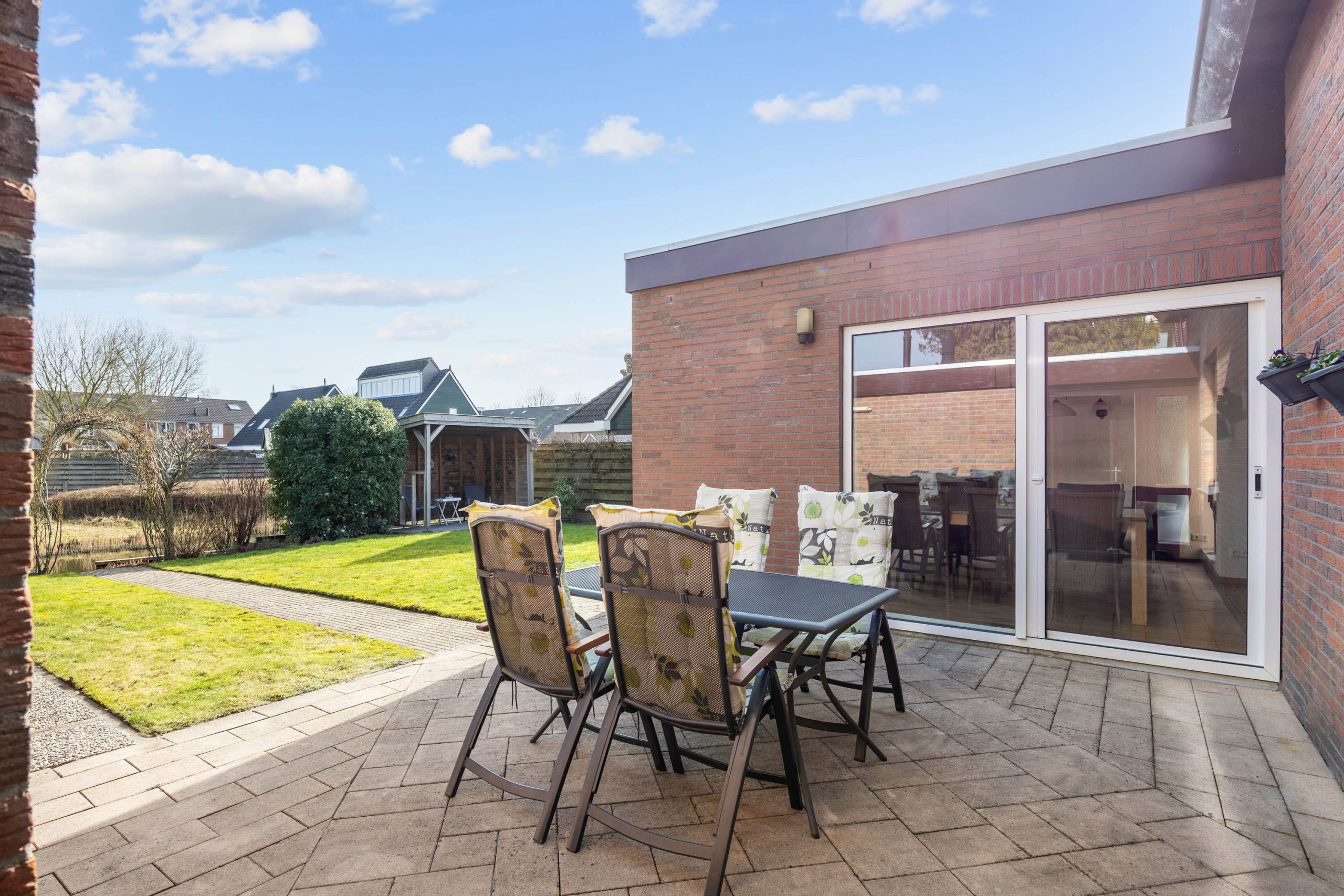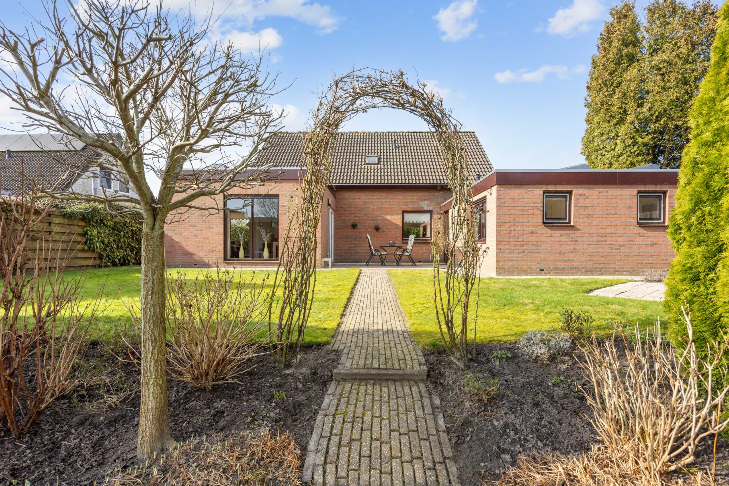 De ruime, zonnige tuin heeft een besloten karakter met veel privacy en bestaat uit een overkapping, gazon, terrassen, borders en grenst direct aan het water van het Geert Reinderspark.