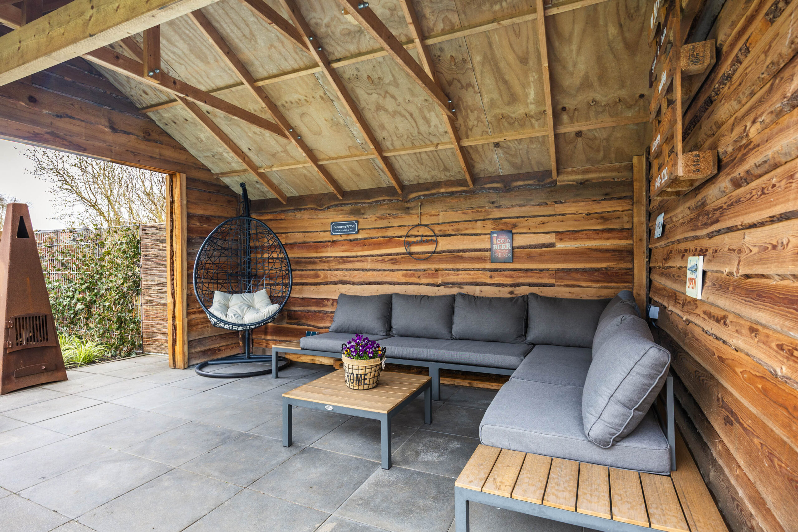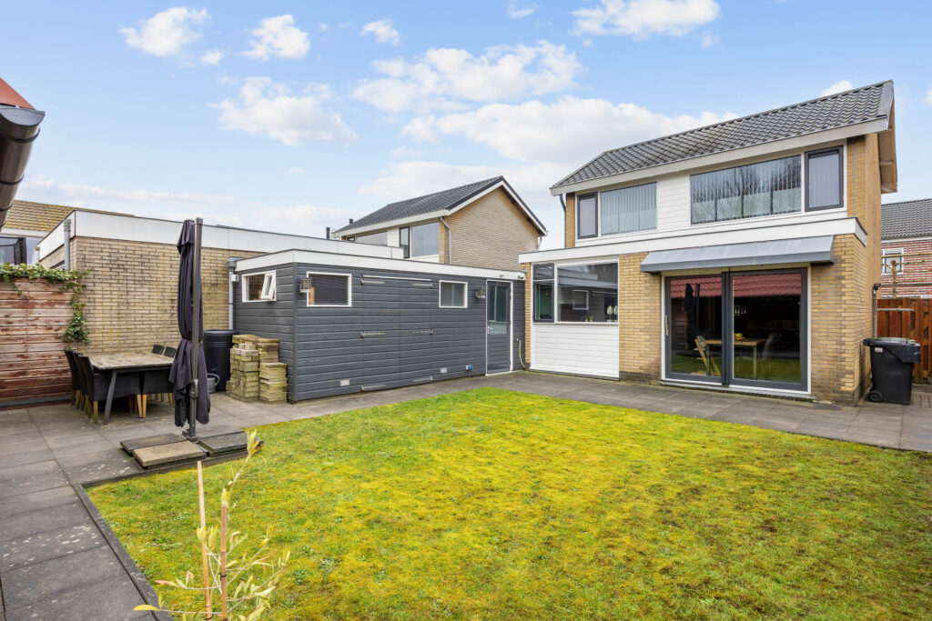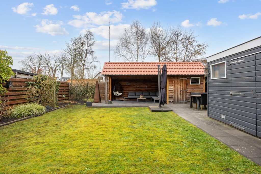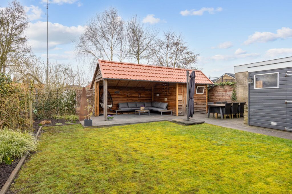Je vindt veel privacy en beschutting in de, op het noorden gelegen, maar toch zonnige achtertuin. De ruime tuin heeft een achterom en bestaat grotendeels uit terras, gras en borders. De houten tuinberging is ideaal voor het stallen van de fietsen en/- of tuinmeubilair en de sfeervolle veranda/ terrasoverkapping met berging maken het geheel compleet.