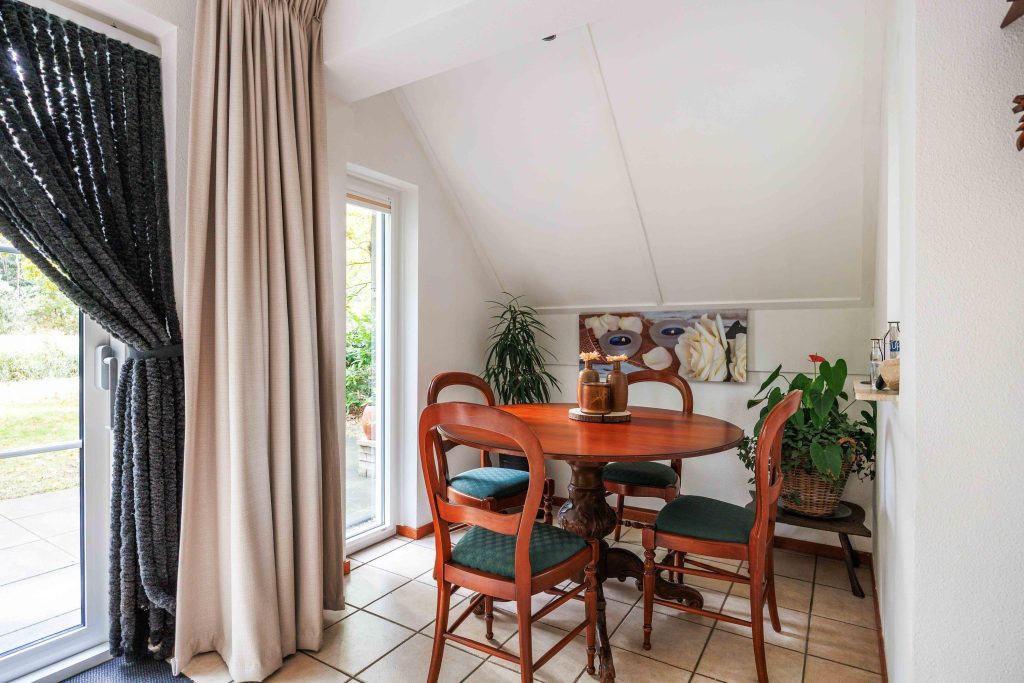 Vanuit de entree is er toegang tot het toilet, de nette badkamer met wastafelmeubel en inloopdouche, en de slaapkamer op de begane grond van circa 8,5m². Vervolgens kom je in de lichte, sfeervolle, tuingerichte woonruimte van ruim 30m² met een gezellige zithoek, rookkanaal en schuifpui naar de tuin. De moderne keuken (2022) is voorzien van een inductiekookplaat, vaatwasser, koelkast, afzuigkap en combimagnetron. Bovendien heb je vanuit deze leefruimte fraai zicht over de tuin en op de bosrand.