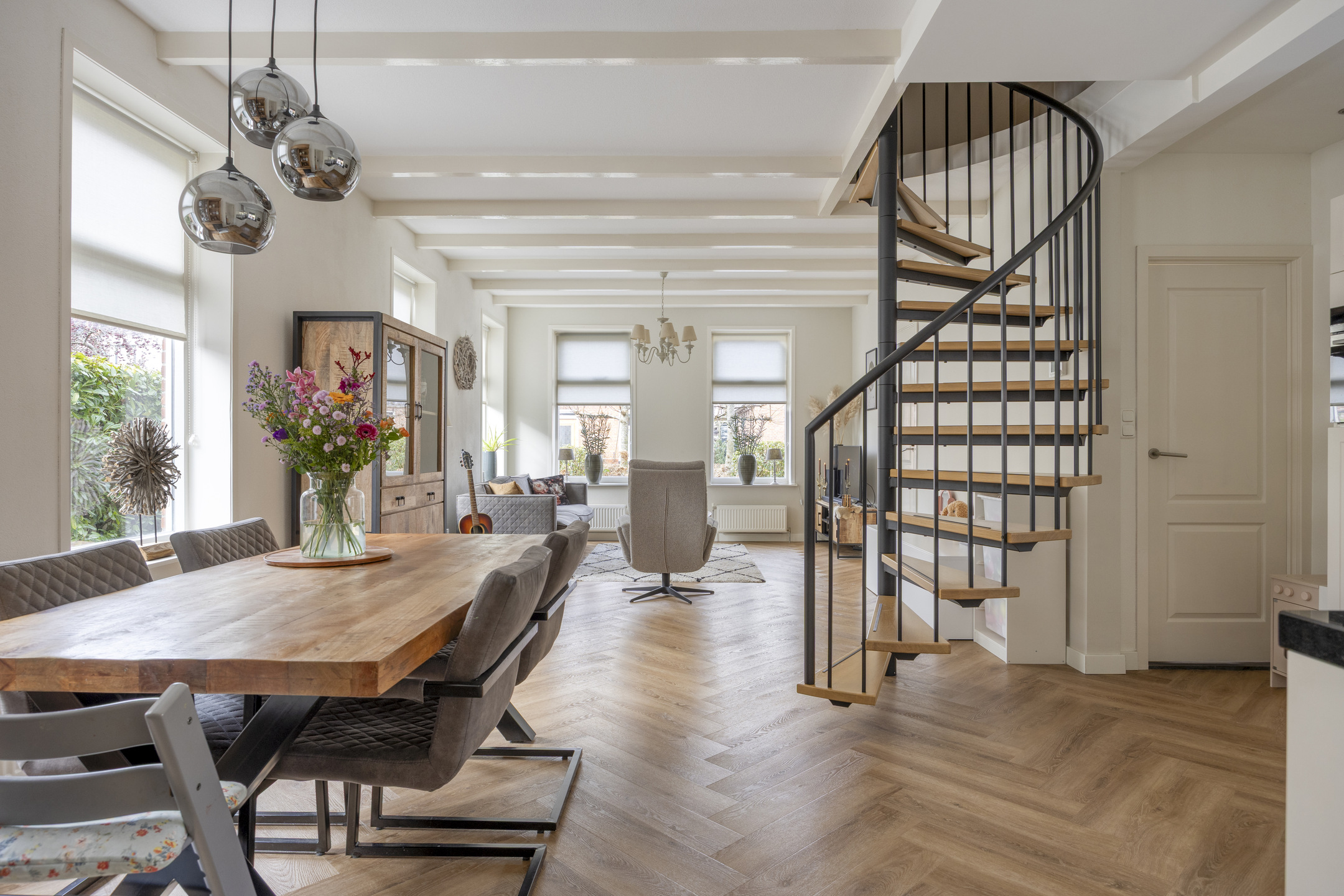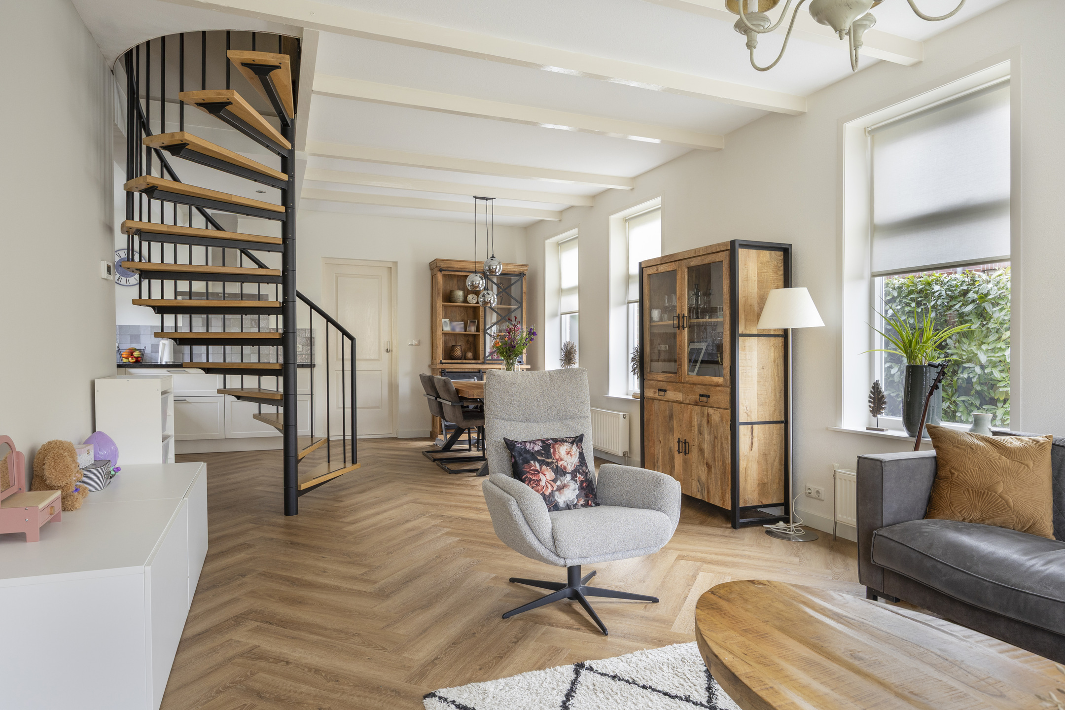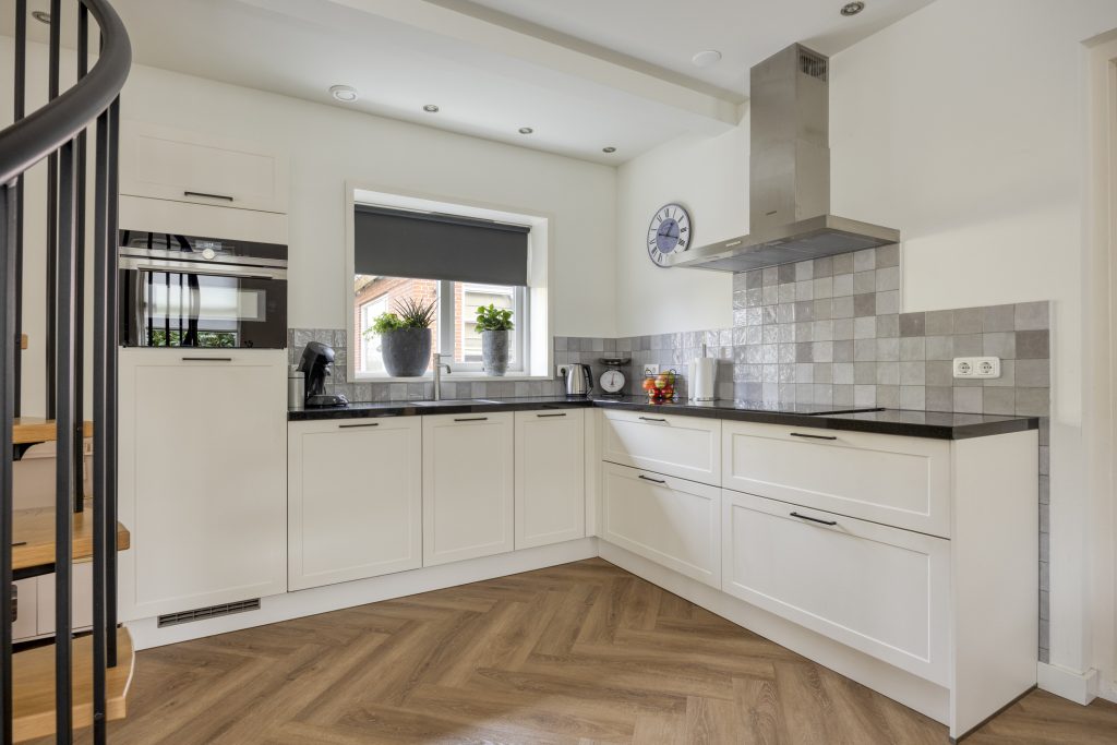 Vanuit de entree met moderne meterkast kom je in de royale leefruimte/living van ca. 40 m² met een fraaie pvc-vloer (2022) in visgraatmotief en een open spiltrap. Deze heerlijke lichte leefruimte bestaat uit een sfeervolle zithoek/woonkamer aan de straatzijde en een ruime woonkeuken met een luxe keukeninrichting (2022) en een inloop-/voorraadkast.