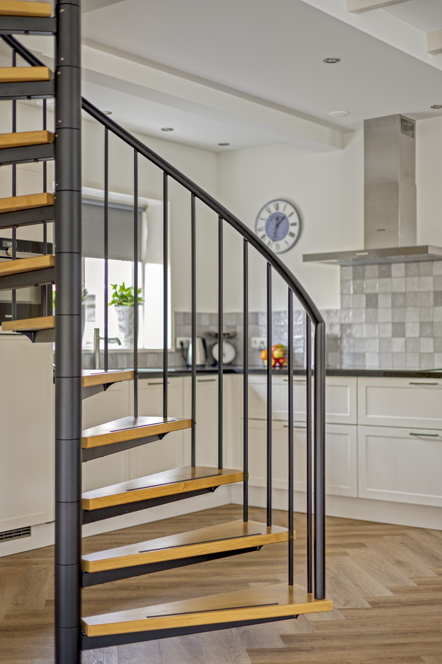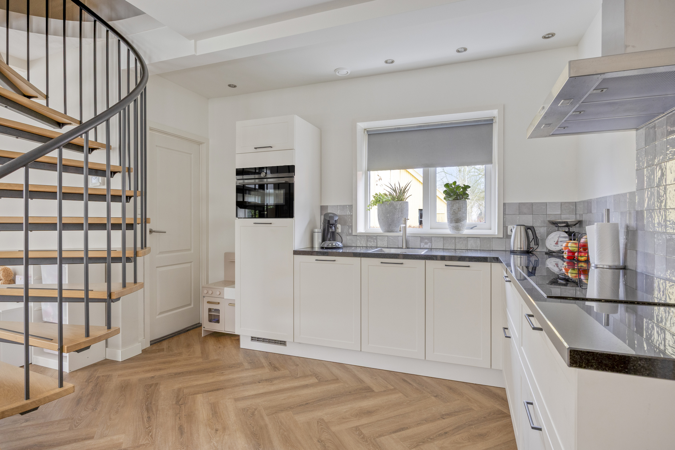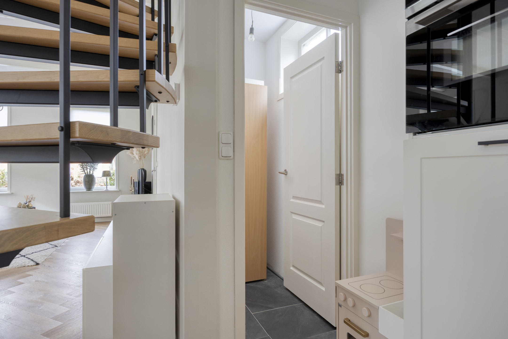 Vanuit de entree met moderne meterkast kom je in de royale leefruimte/living van ca. 40 m² met een fraaie pvc-vloer (2022) in visgraatmotief en een open spiltrap. Deze heerlijke lichte leefruimte bestaat uit een sfeervolle zithoek/woonkamer aan de straatzijde en een ruime woonkeuken met een luxe keukeninrichting (2022) en een inloop-/voorraadkast.