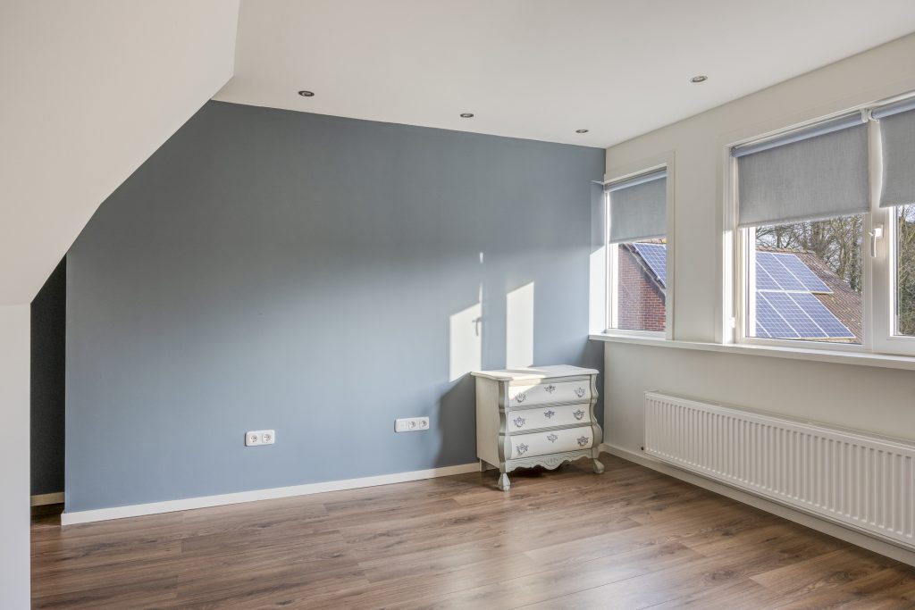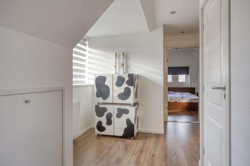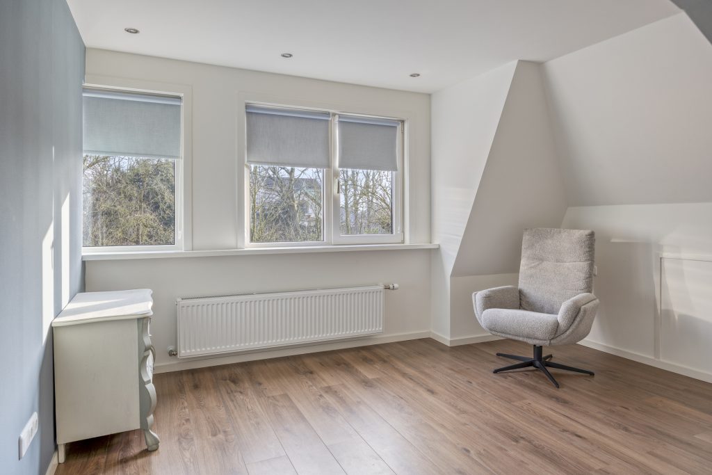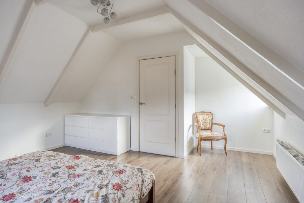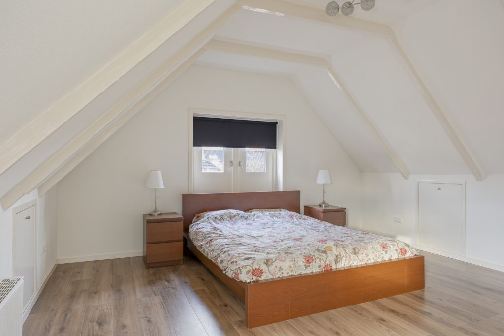 Vannuit de leefruimte kom je middels een moderne spiltrap op de overloop met ruime dakkapel, knieschotten en een separaat tweede toilet (sanibroyeur). De overloop geeft toegang tot de drie prima slaapkamers van resp. ca. 9,5, 12 en 14,5m² (gemeten op 1,5m hoogte)