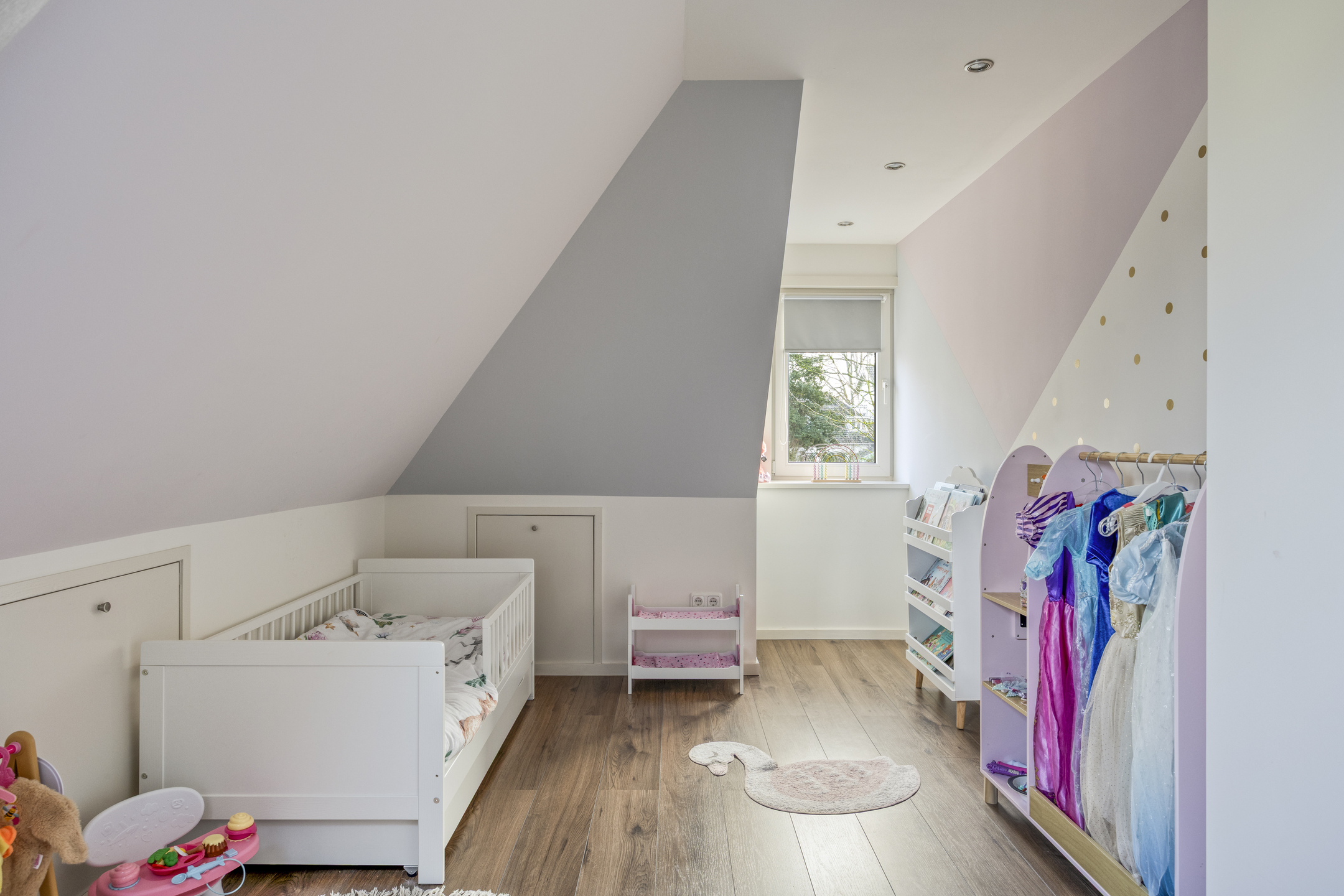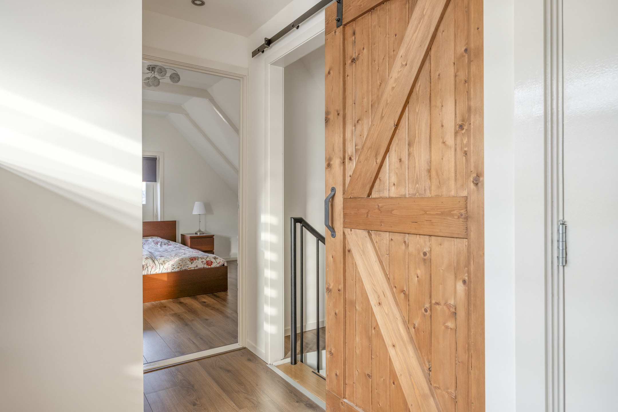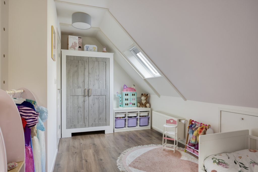 Vannuit de leefruimte kom je middels een moderne spiltrap op de overloop met ruime dakkapel, knieschotten en een separaat tweede toilet (sanibroyeur). De overloop geeft toegang tot de drie prima slaapkamers van resp. ca. 9,5, 12 en 14,5m² (gemeten op 1,5m hoogte)
